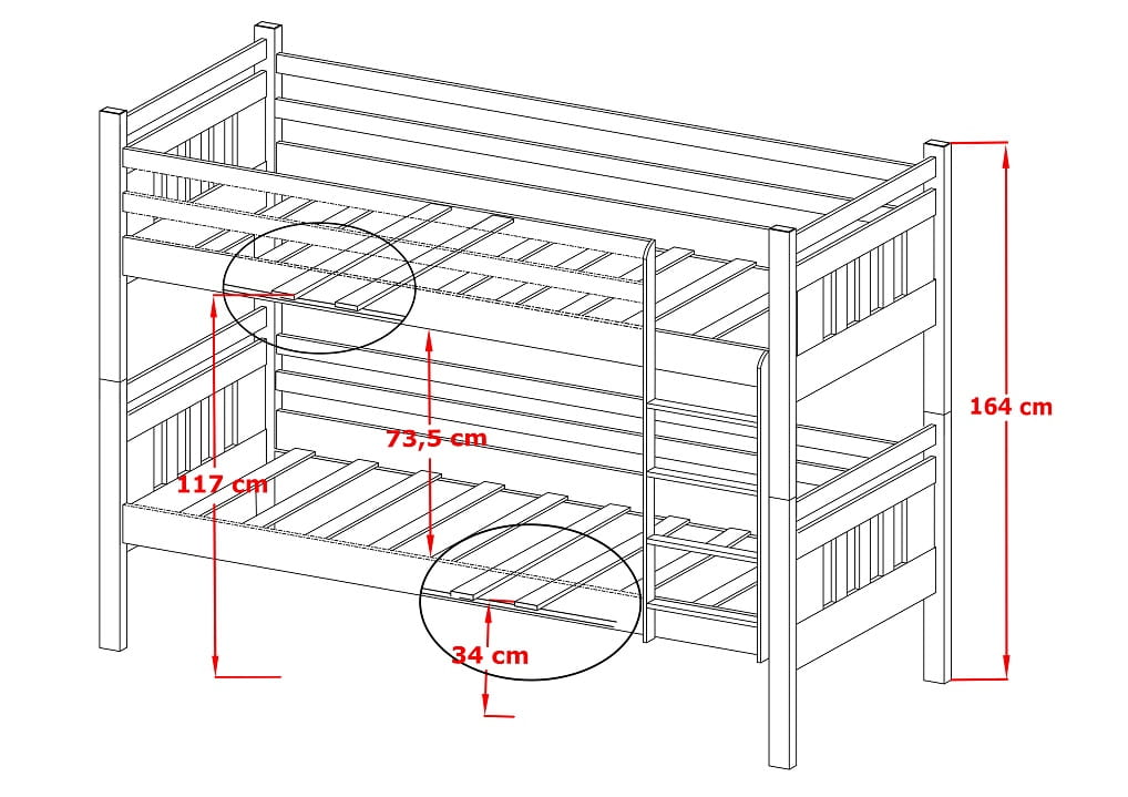 Das Etagenbett Adam ist ein Vorschlag für das Kinderzimmer. Das Bett wird besonders für Kinder vorgesehen, die gute Bewegungskoordination aufweisen, so dass die mit dem Hochklettern der Leiter leicht zurechtkommen. Die Hersteller empfehlen, dass die Benutzer der oberen Etage mindestens 6 Jahre alt sind. Das Möbel wurde ausschließlich aus Kieferholz angefertigt. Einzelne Teile haben keine scharfe oder gefährliche Gegenstände für Kinder. Die obere Etage wird durch Barrieren abgesichert, die bei allen Rahmenseiten installiert werden. Der Abstand zwischen den Etagen erleichtert die Leiter mit abgerundeten Stufen. Das Modell Adam ist160 cm hoch. Die untere Matratze liegt 35 cm über dem Boden und die obere Matratze - 115 cm. Im Preis werden auch zwei umfangreiche Schubladen inbegriffen, die das Bettzeug aufbewahren können. Die sind durch die Gummiroller ausziehbar. Die bilden keinen integrativen Teil vom Bett. Das Möbel ist in unterschiedlicher Größe erhältlich. An jeweiligem kann man richtige Matratze anpassen. Das Bett ist in vielen attraktiven Farben erhältlich, die an die beliebige Gestaltung des Zimmers angepasst werden kann.