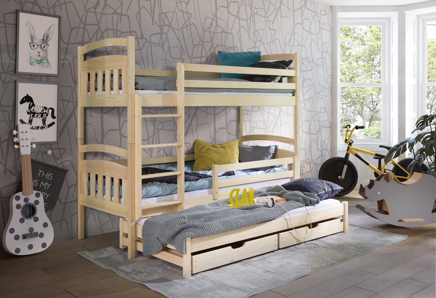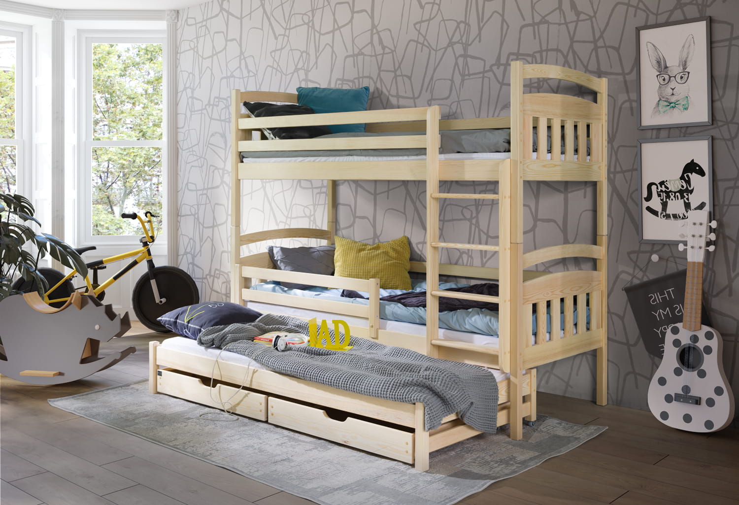 Das Etagenbett Alan ist ein hohes Möbel für 3 Kinder. Es ist eine ideale Lösung für die Geschwister, die gemeinsam leben. Das Möbel ist deutlich platzsparend, deshalb eignet es sich gut besonders für die kleine Wohnungen. Das Modell Alan ist 164 cm hoch. Die obere Matratze ist 112 cm und die untere 29 cm hoch. Unter dem unteren Bett befindet sich einen zusätzlichen Schlafplatz, der man jederzeit ausziehen kann. Das Element kann auch ein selbstständiges Möbel darstellen. Das ausziehbare Bett ist 10 cm kleiner als andere. Die obere und untere Etage wird mit einer zusätzlichen Absicherung i Form von Barrieren ausgestattet. Die untere kann man demontieren und die obere wird fest befestigt. Das Modell Alan wurde aus den soliden Kieferholzbrettern angefertigt. Die ganze Konstruktion wird durch Quadratbeine unterstützt, die das Möbel zusätzlich stabil machen. Im Preis werden zwei tiefe Schubladen für das Bettzeug inbegriffen. Das Möbel ist in unterschiedlicher Größe und unterschiedlichen Farben erhältlich. Bei der Fertigung wurden ausschließlich gesundheitssichere Farben verwendet.