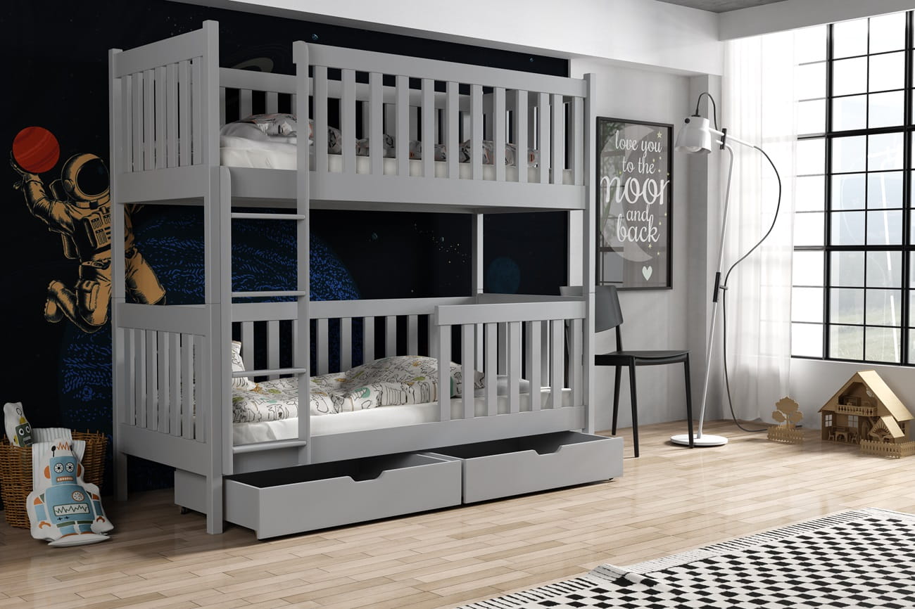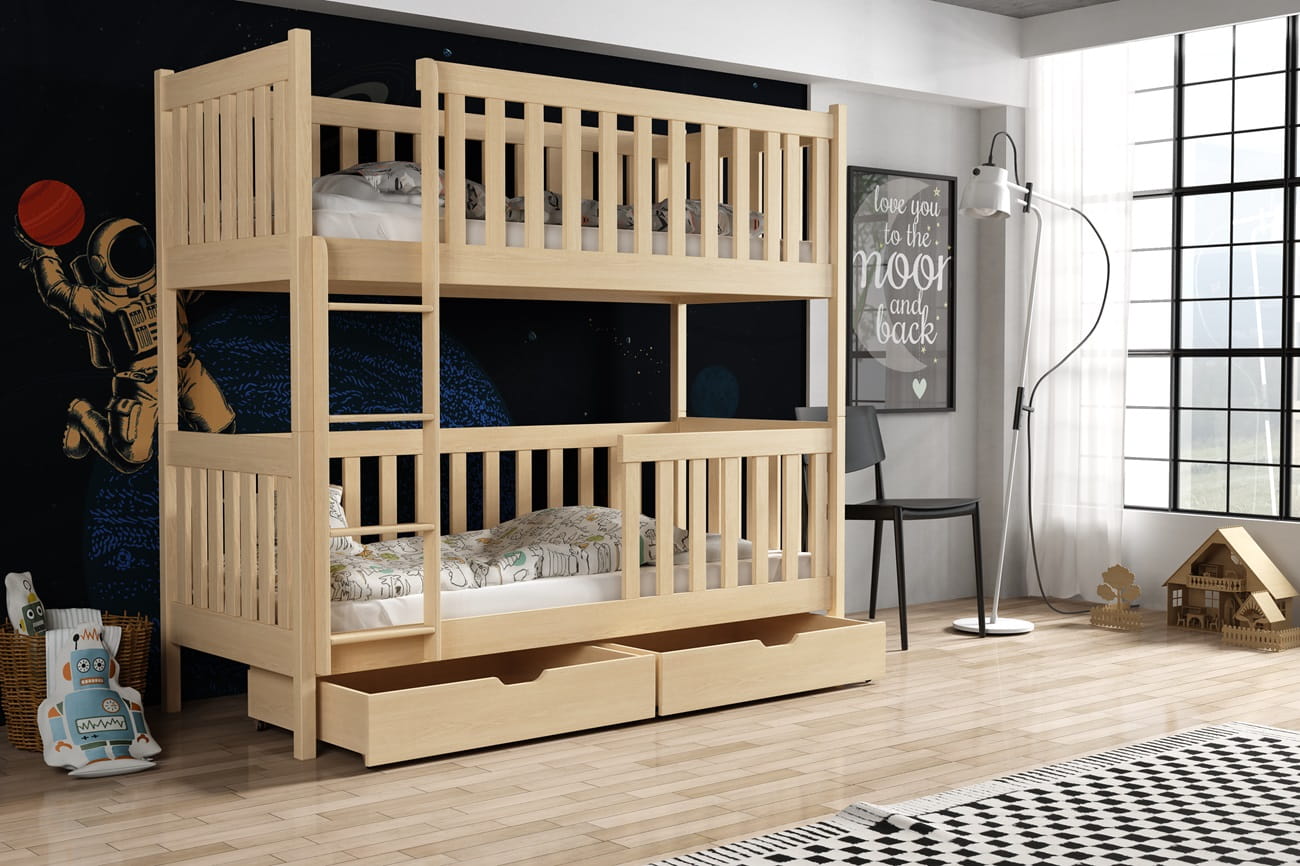 Das Bett wird aus Voll-Kiefernholz hergestellt. So ist es stabil und sicher.