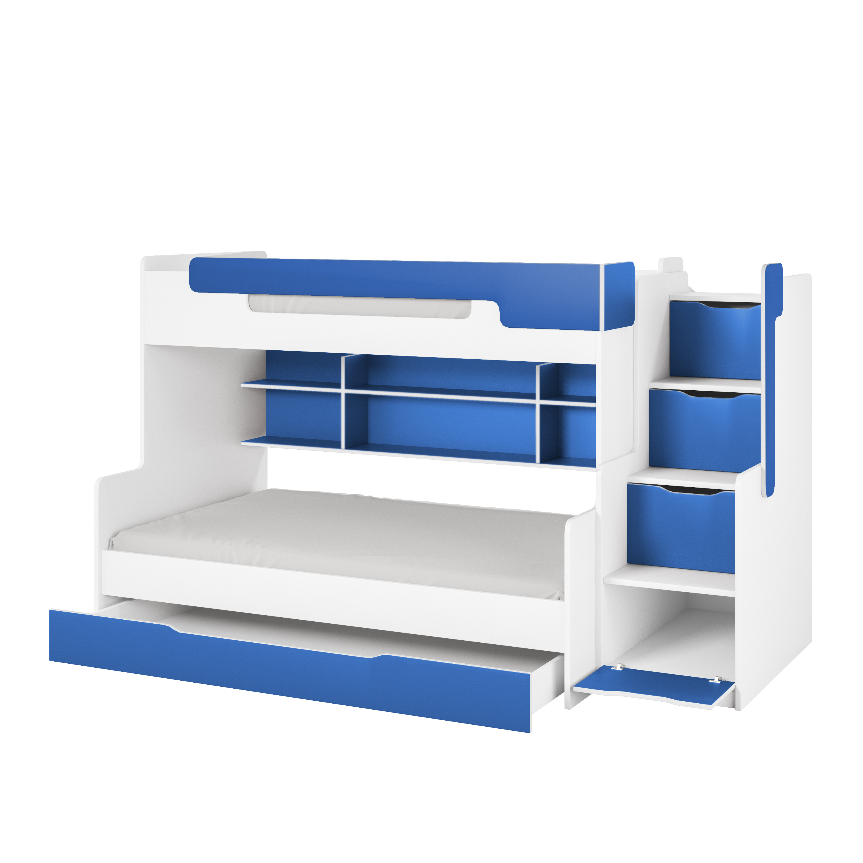 Das Zimmer für drei oder zwei Kinder muss so eingerichtet werden, dass dort genug Platz sowohl zum Lernen und als auch zum Spielen bleibt. Unsere Konstruktionslösung und die höchste Qualität der einzelnen Elementen lassen uns Ihre Herausforderung zu erfüllen. Jeder Zentimeter des Zimmers wird dank dem Bett genutzt. Die praktischen Fächer helfen Ordnung im Kinderzimmer zu halten.