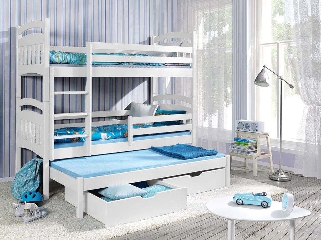 Das Etagenbett Julia III eignet sich für das Kinderzimmer etwas zahlreicher Geschwister. Es kann auch für zwei Kinder gekauft werden, die von Zeit zu Zeit übernachten. Möbel ist ein klassisches, hohes Etagenbett mit hohen Barrieren, die sicheren Schlaf für Kinder gewährleisten. Zusätzlich wurde ein Schlafplatz eingestellt. Es befindet sich unter der unteren Kondignation. Der Schlafplatz kann man in jeder Zeit ein- und ausziehen. Das Modell Julia III ist eine außergewöhnliche Platzersparnis - das Bett nimmt die gleiche Fläche ein wie ein Möbelstück für eine Person Das ganze Modell wurde aus den soliden Kieferholzbrettern angefertigt. Das Bett ist in natürlicher Holzfarbe und unterschiedlichen Farben erhältlich. Alle Farben und Lacken, die zur Herstellung verwendet wurden, weisen erforderliche Bescheinigungen auf. Im Preis werden auch zwei Matratzen sowie zwei ausziehbare Schubladen inbegriffen, in denen man das Bettzeug aufbewahren kann. Das Möbel lässt sich in drei separate Exemplare zerlegen.