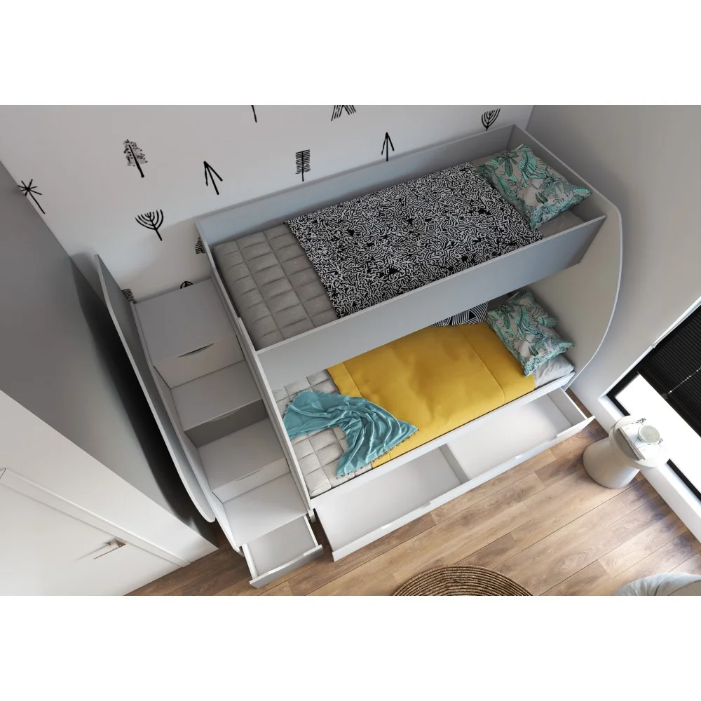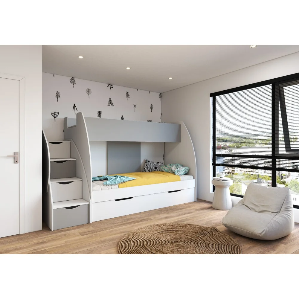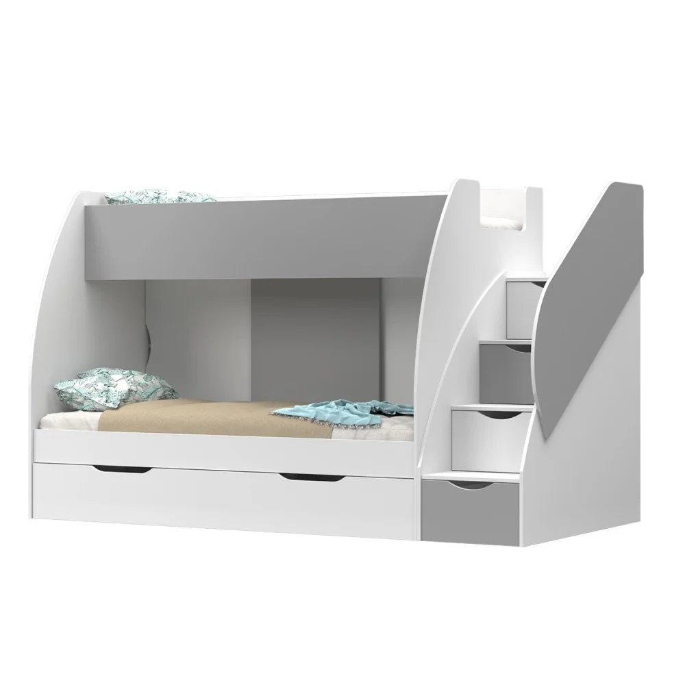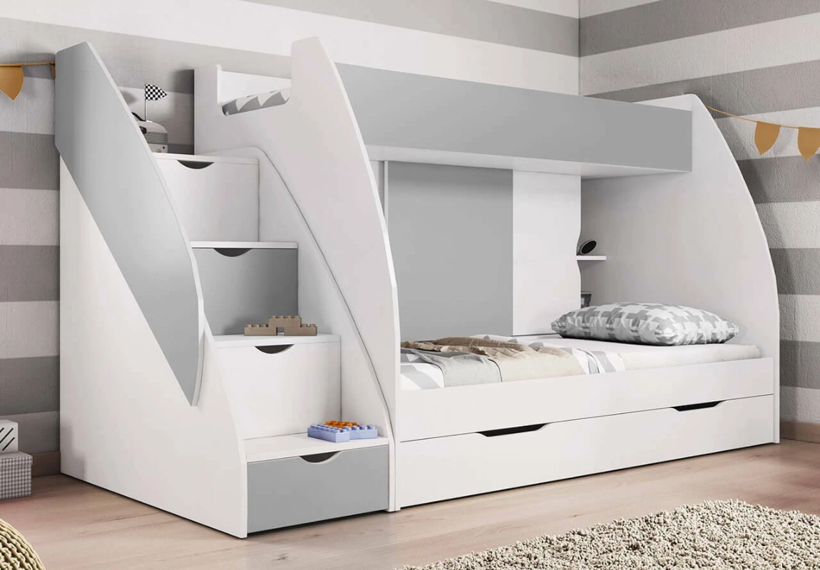 Etagenbett Funktionsbett MARGO für 2 Kinder mit Treppe weiß + grau