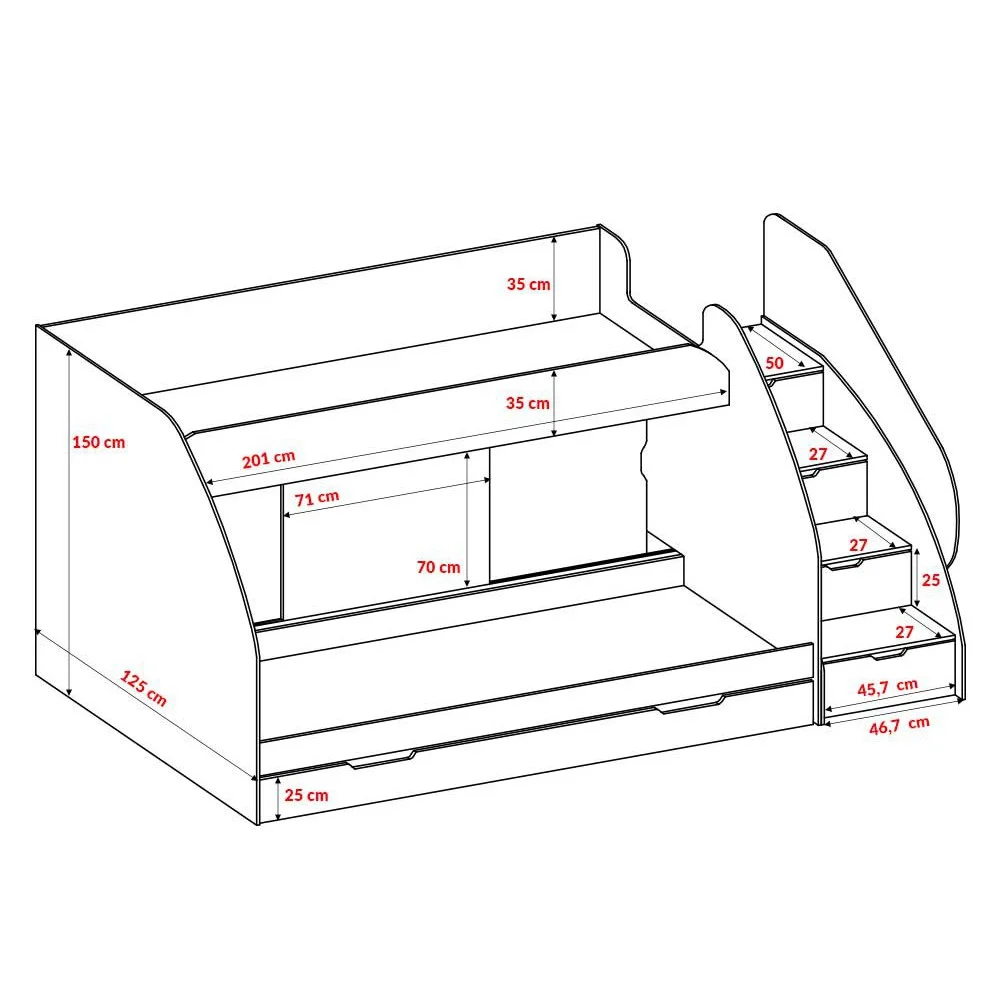 Das Etagenbett Margo für 2 Personen ist ein bequemes Möbel für das Kinderzimmer. Es kann von zwei Kindern benutzt werden. Ein solides, hohes Möbelstück bietet nicht nur Schlafkomfort, sondern auch Sicherheit bei Kinderspielen an. Beide Etage haben Schlaffläche 200 x 80. Zwischen ihnen befand sich eine große Anzahl von bequemen Regalen für handliche Gegenstände. Die obere Etage kann man mit der speziellen Stufen der Leiter erreichen. Die bestehen aus ausziehbaren Schubladen, in denen man verschiedene Gegenstände aufbewahren können. Unten wird umfangreiche Schublade für das Bettzeug eingestellt. Das Bett ist in unterschiedlichen Farben erhältlich, die beim Bestellen festzustellen sind. Das ganze Modell wurde aus der gegen mechanische Beschädigungen und feuchtigkeitsbeständigen Laminatplatte angefertigt.