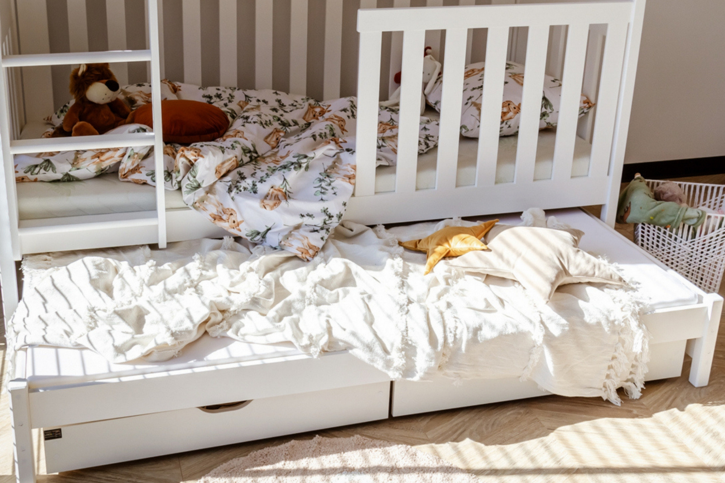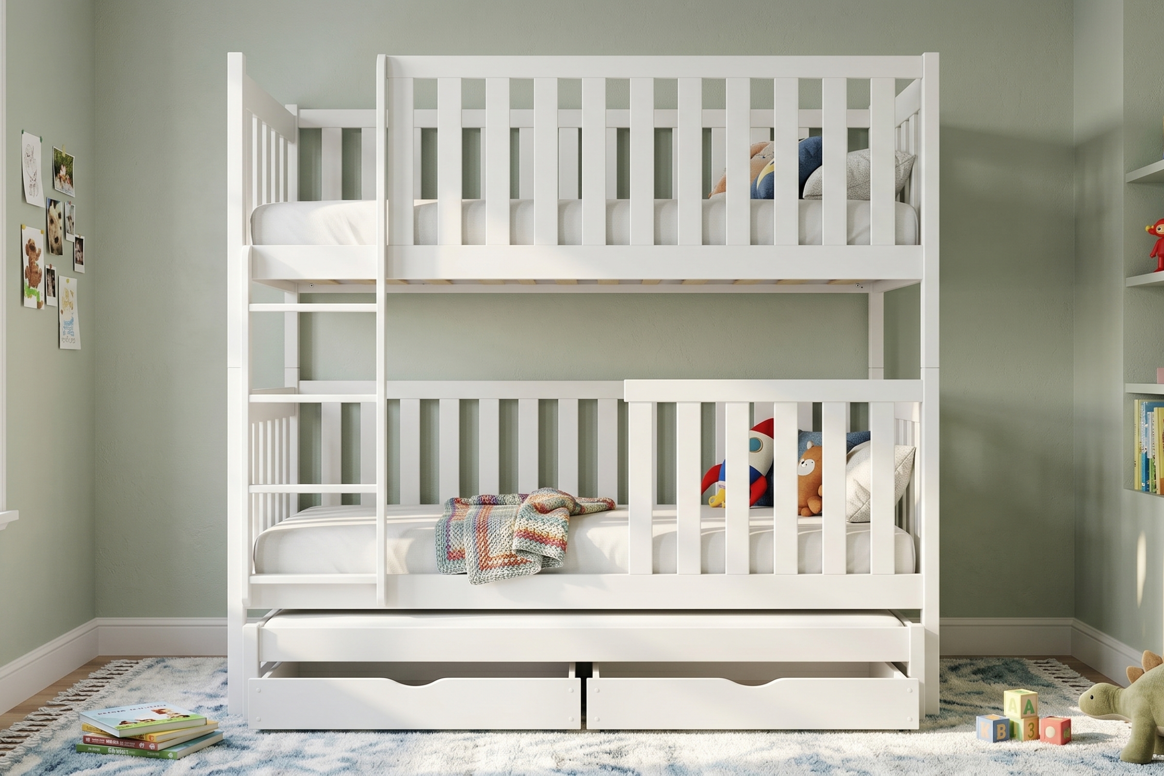 Das Etagenbett OLIVIA 90x200 in Weiß ist eine praktische Lösung für Kinderzimmer mit wenig Platz. Es bietet 3 Schlafplätze, 2 Bettkästen, eine universell montierbare Leiter und kann bei Bedarf auch als zwei Einzelbetten aufgebaut werden. Ideal für Familien, Geschwisterzimmer und Übernachtungsgäste.