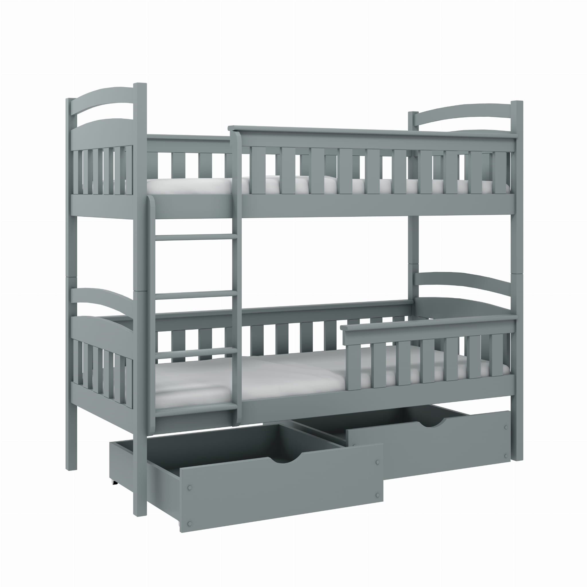 Das Etagenbett Rio ist ein Möbel für 2 Benutzer. Es kann eine perfekte Alternative für ein niedriges Etagenbett sein. Das Etagenbett ist ein Möbel für die Geschwister. Die Etagenbetten eignet sich besonders für kleinere Räume, da die so viel Platz wie ein Einzelbett nehmen. Das Modell Rio ist 160 cm hoch. Der Abstand zwischen den Betten beträgt sogar 68 cm. Die obere Matratze ist  115 cm und die untere 35 cm hoch. Sowohl die obere als auch die untere Etage werden zusätzlich durch Barrieren abgeschirmt, was das Entgleiten verhindert. Das ganze Modell wurde sorgfältig aus den soliden Kieferholzbrettern angefertigt. Die ganze Konstruktion wird durch Quadratbeine unterstützt, die das Möbel zusätzlich stabil machen. Das Bett ist in vielen attraktiven Farben erhältlich, die an die beliebige Gestaltung des Kinderzimmers angepasst werden kann. Das Modell Rio ist in unterschiedlicher Größe bis zu 90 x 200 cm erhältlich. Unten befinden sich zwei tiefe Schubladen, die das Bettzeug aufbewahren können. Das Bett eignet sich für die selbstständige Montage.