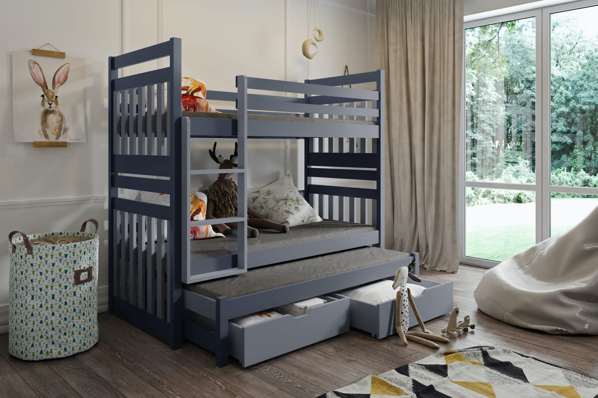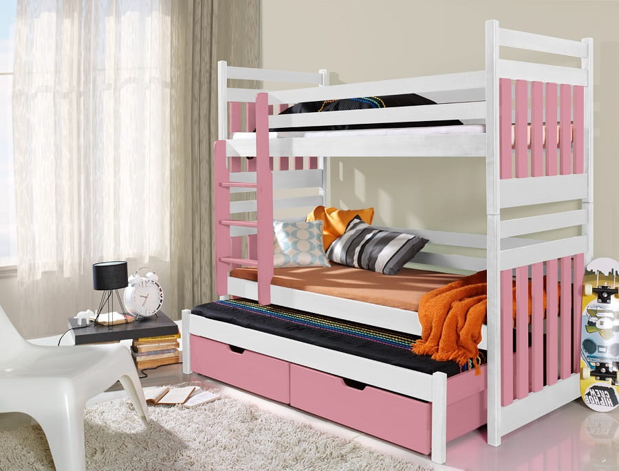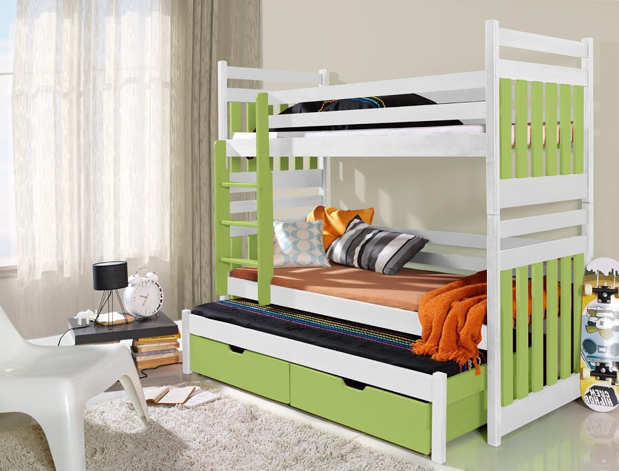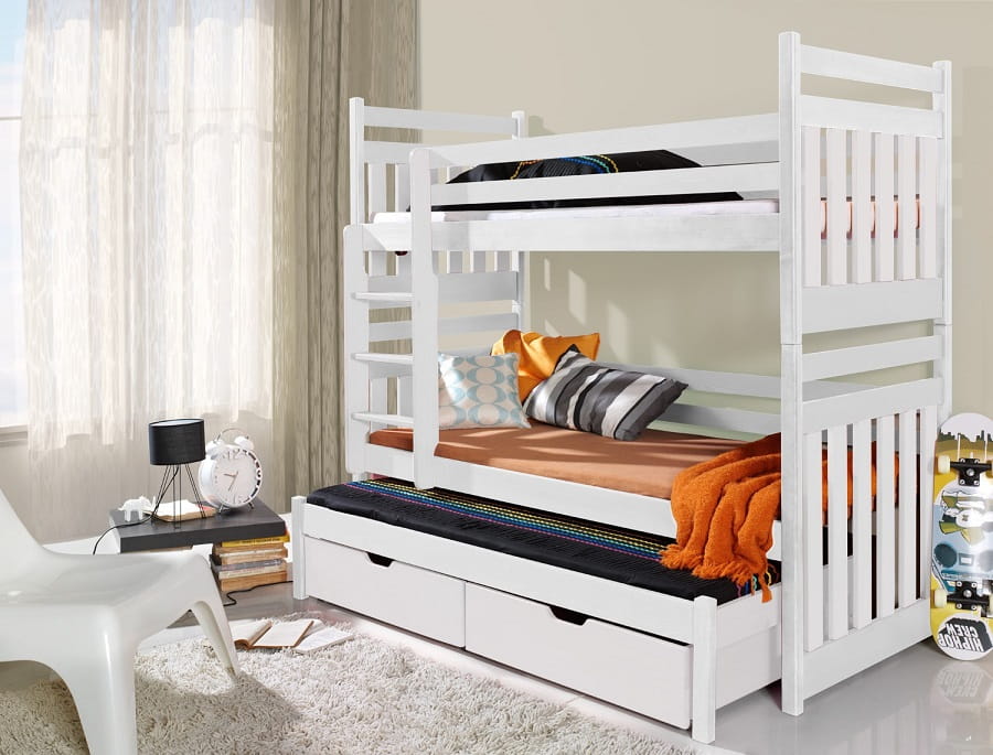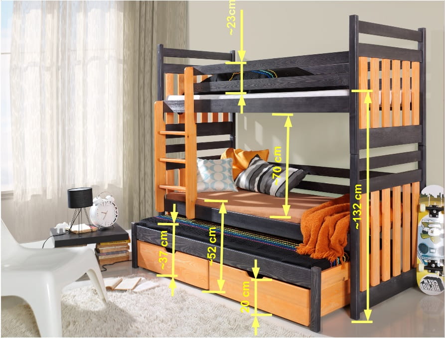 Das Etagenbett Stella eignet sich am beten für das Kinderzimmer, wo drei Kinder wohnen. Es kann auch für zwei Kinder gekauft werden, die von Zeit zu Zeit jemanden übernachten. Das Möbel ist deutlich platzsparend, denn es nimmt so viel Platz wie ein Einzelbett ein. Stella ist ein traditionelles, hohes Etagenbett. Zu traditionellen zwei Etagen wurde noch eine zusätzliche Etage hinzugefügt, die sich unter der unteren Etage befindet. Das dritte Bett kann man in jeder Zeit aus- und einziehen. Zwei Kondignationen werden durch Barrieren abgesichert. Der Abstand zwischen den Etagen erleichtert die Leiter. Das Möbel wurde ausschließlich aus den soliden Kieferholzbrettern angefertigt, die optimale Stabilität während des Schlafs und Spielens sicherstellen. Das Bett ist zweifarbig, einige seiner Elemente sind in einer anderen Farbe als das ganze gemalt. Die Farbe kann man zum Zeitpunkt des Einkaufs auswählen. Alle Farben und Lacken, die zur Herstellung verwendet wurden, weisen erforderliche Bescheinigungen auf. Das Bett hat 2 Jahre Garantie.