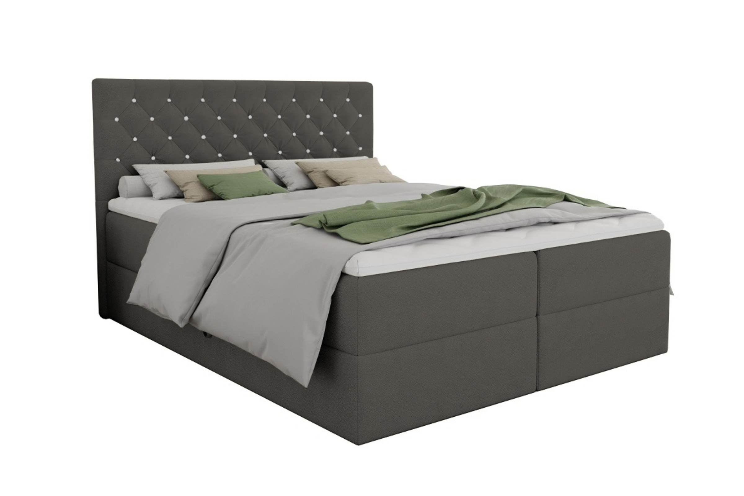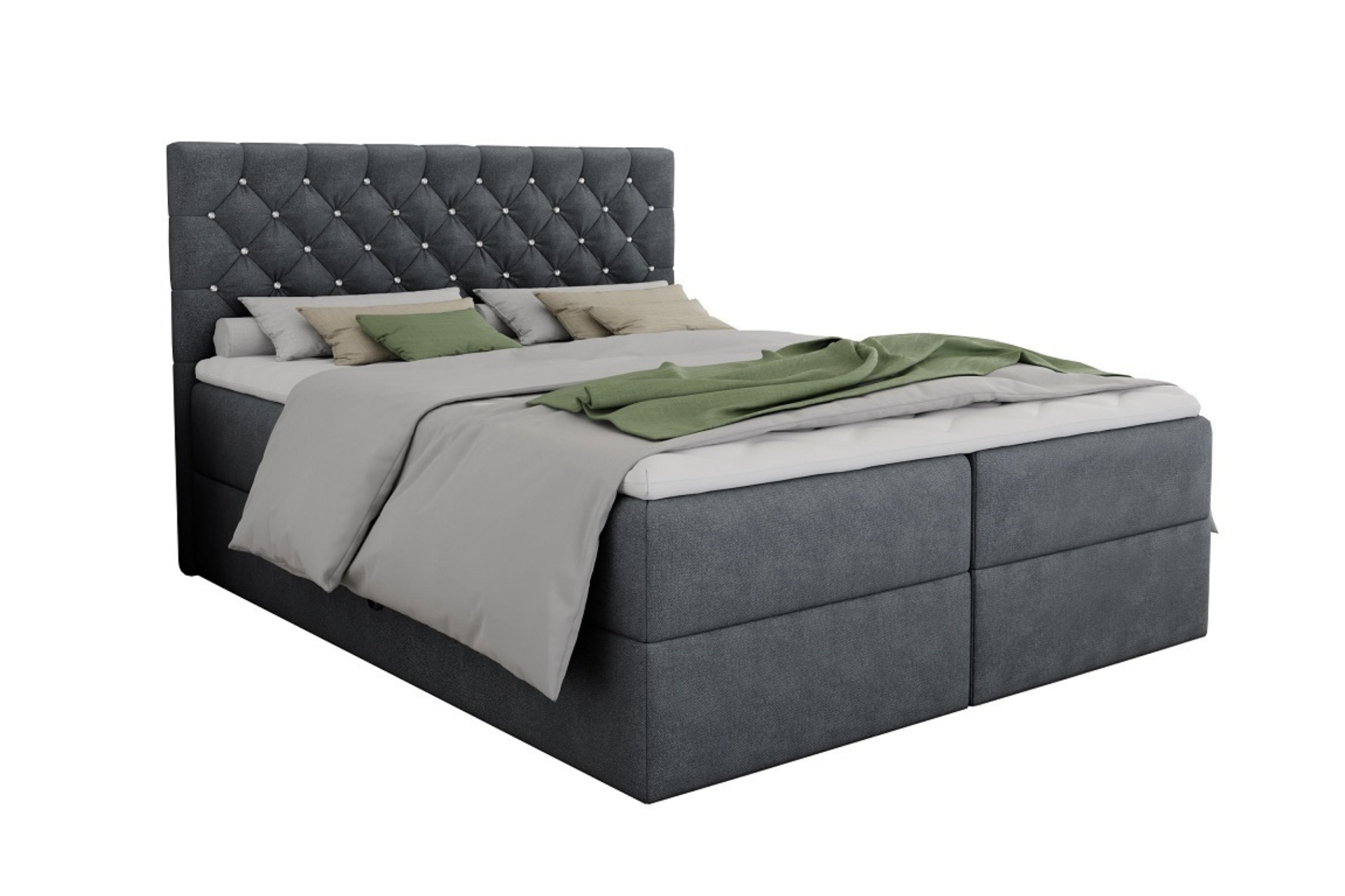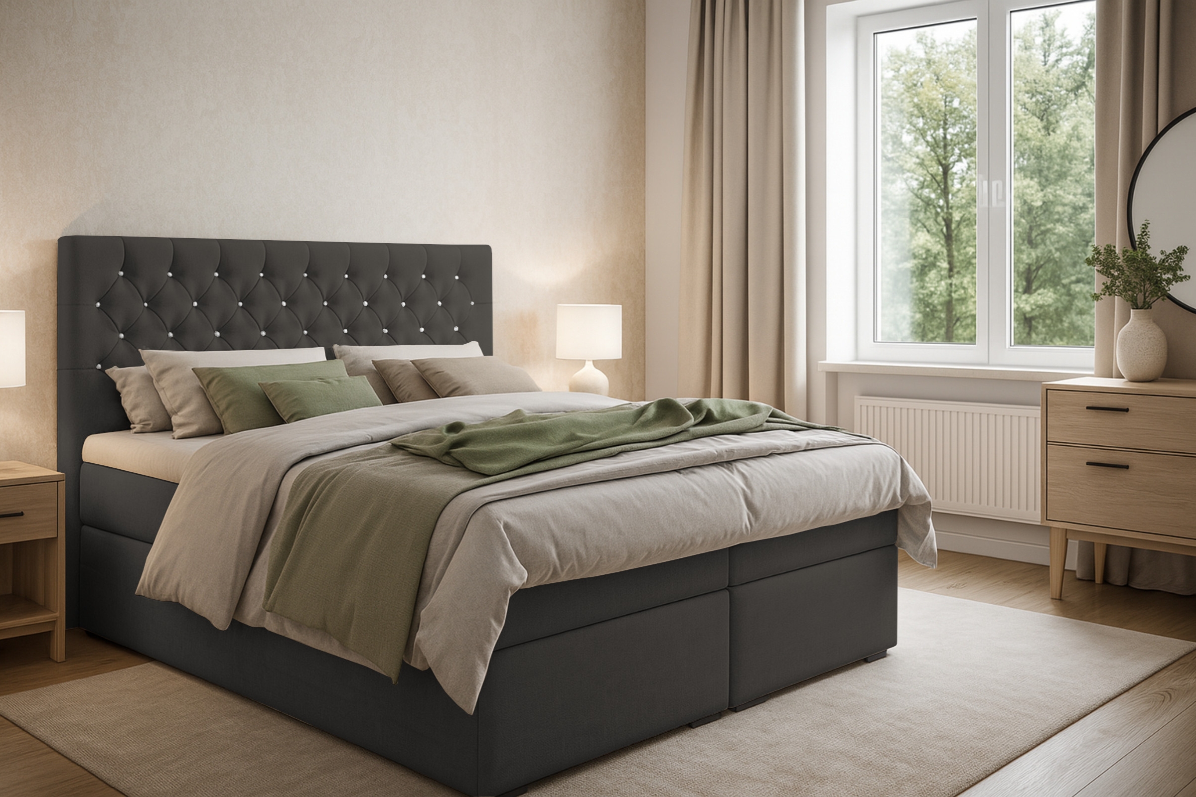 Das sorgfältig gepolsterte Boxspringbett ARAMI mit zwei Bettkästen in Chesterfield- Optik mit edler Knopfheftung. Das Bett ist mit 2 Bonellfederkernmatratzen Härtegrad 3 (H3) ausgestattet, die einen erholsamen, himmlischen Schlaf sichern.