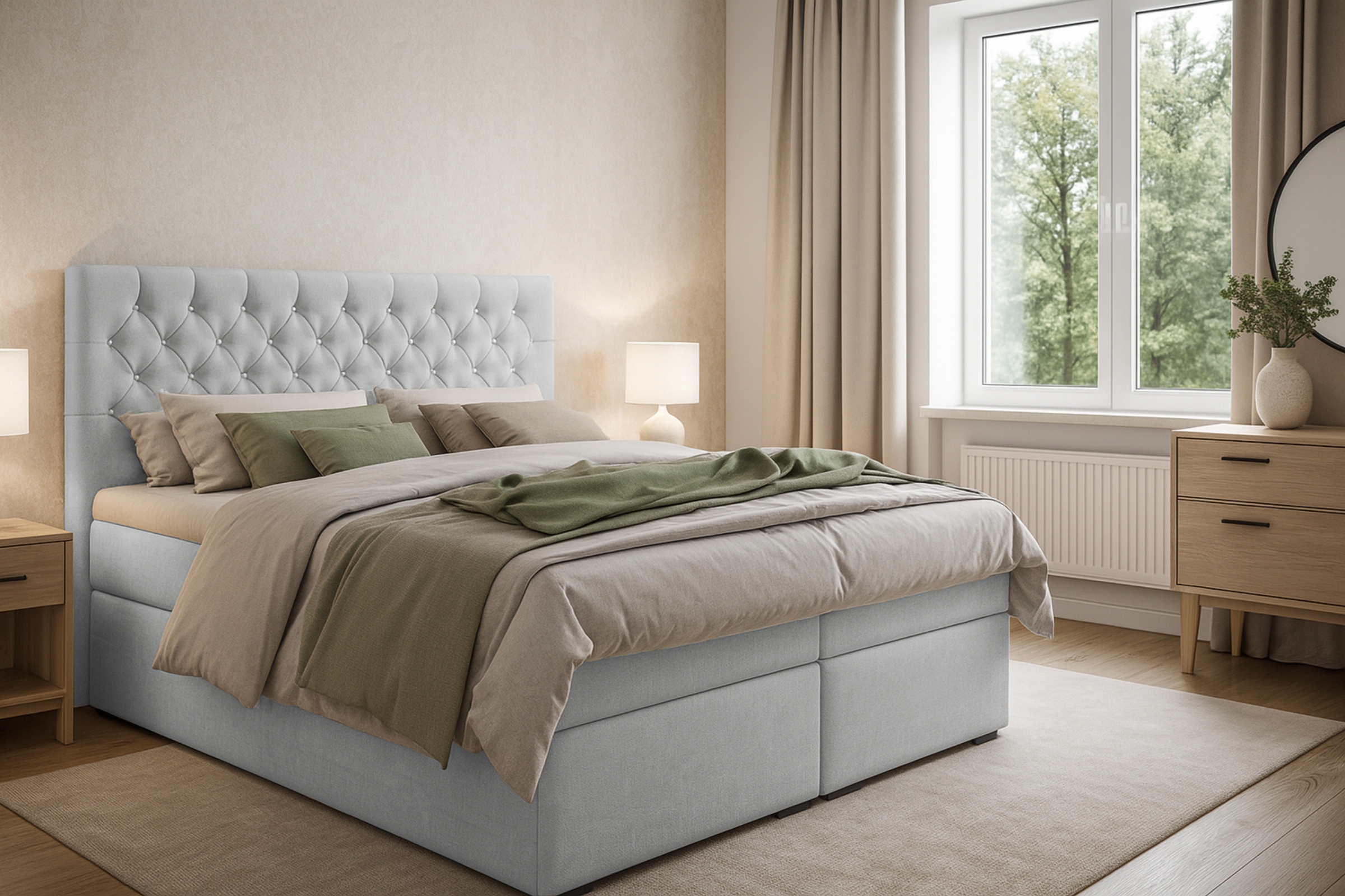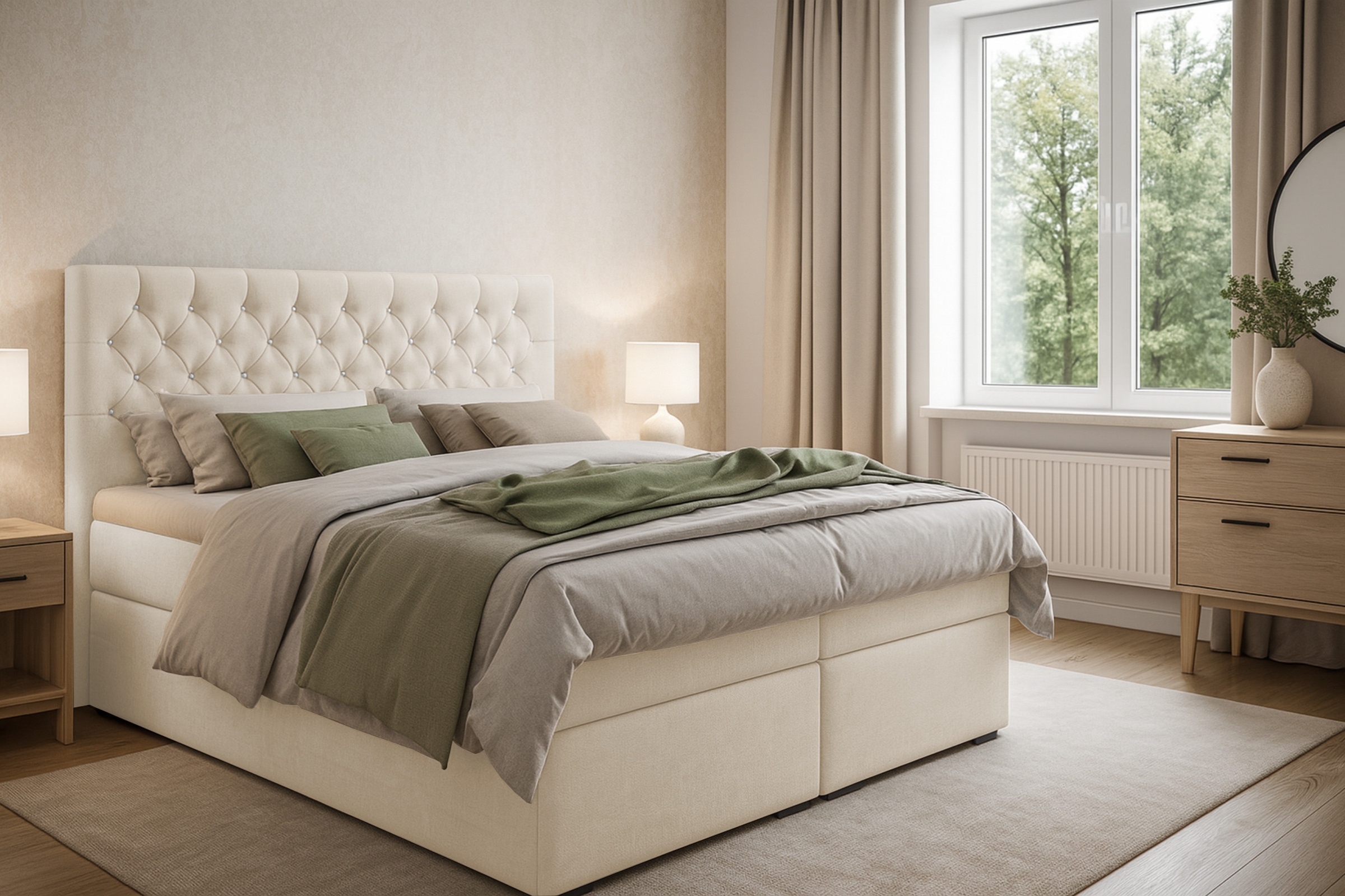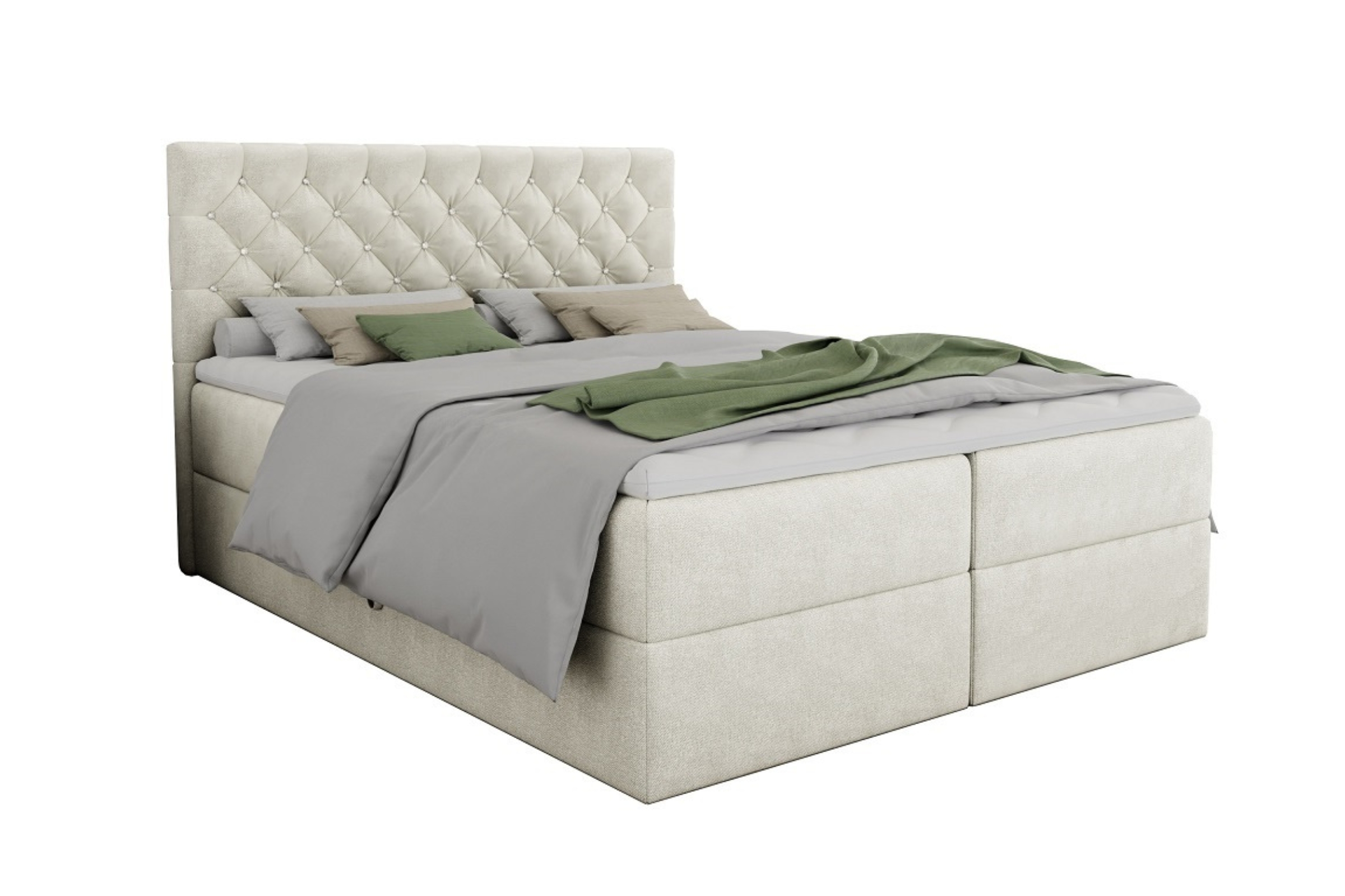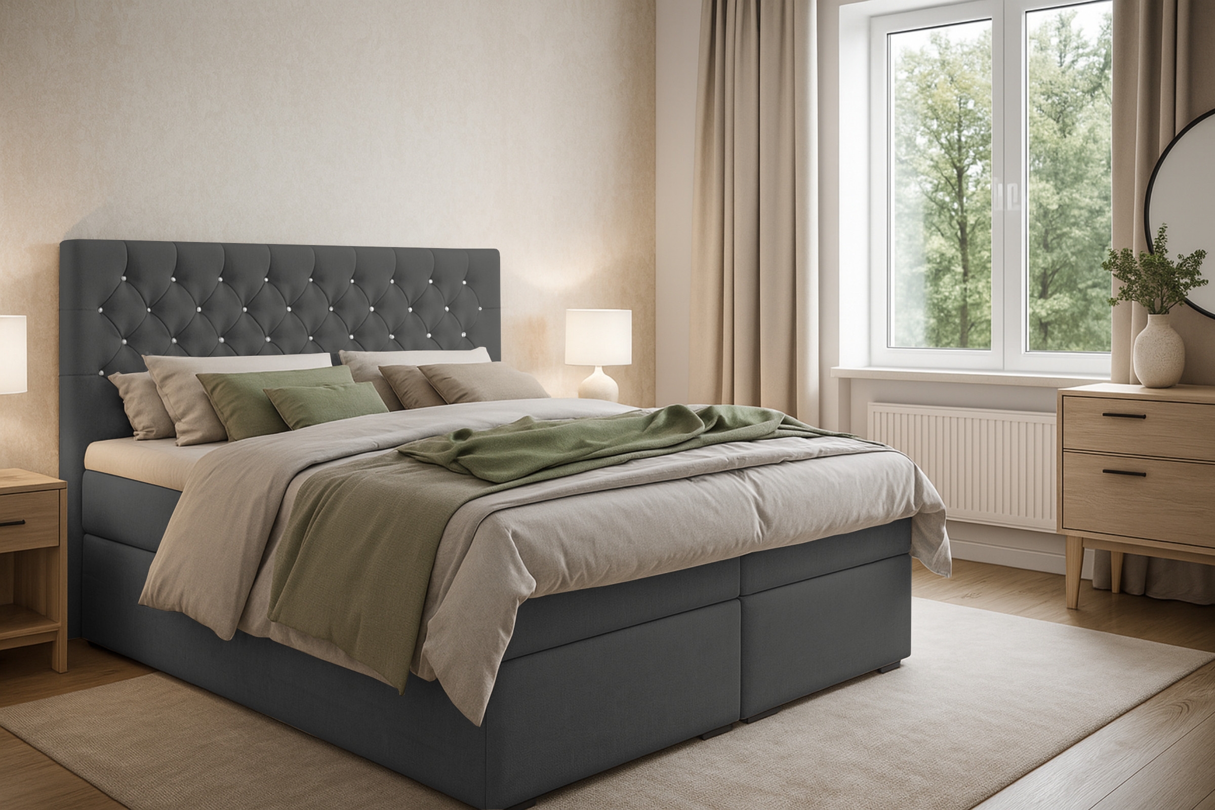 Das sorgfältig gepolsterte Boxspringbett ARAMI mit zwei Bettkästen in Chesterfield- Optik mit edler Knopfheftung. Das Bett ist mit 2 Bonellfederkernmatratzen Härtegrad 3 (H3) ausgestattet, die einen erholsamen, himmlischen Schlaf sichern.