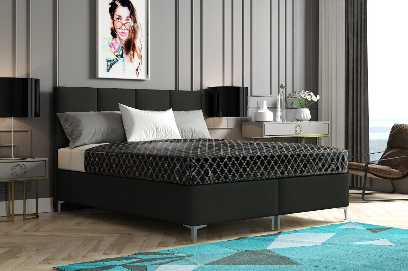 Ein kontinentales Bett garantiert Komfort und Ruhekomfort. Es zeichnet sich durch mehrere Schichten aus, darunter: 2 Behäter für Bettwäsche, eine Untermatratze aus Bonellfedern 19 cm mit einem auf Federn montierten Automaten, und ein 4 cm Topper zur Auswahl. Der Samtstoff Paros / Kronos sorgt dafür, dass Sie sich im Schlafzimmer besonders fühlen.