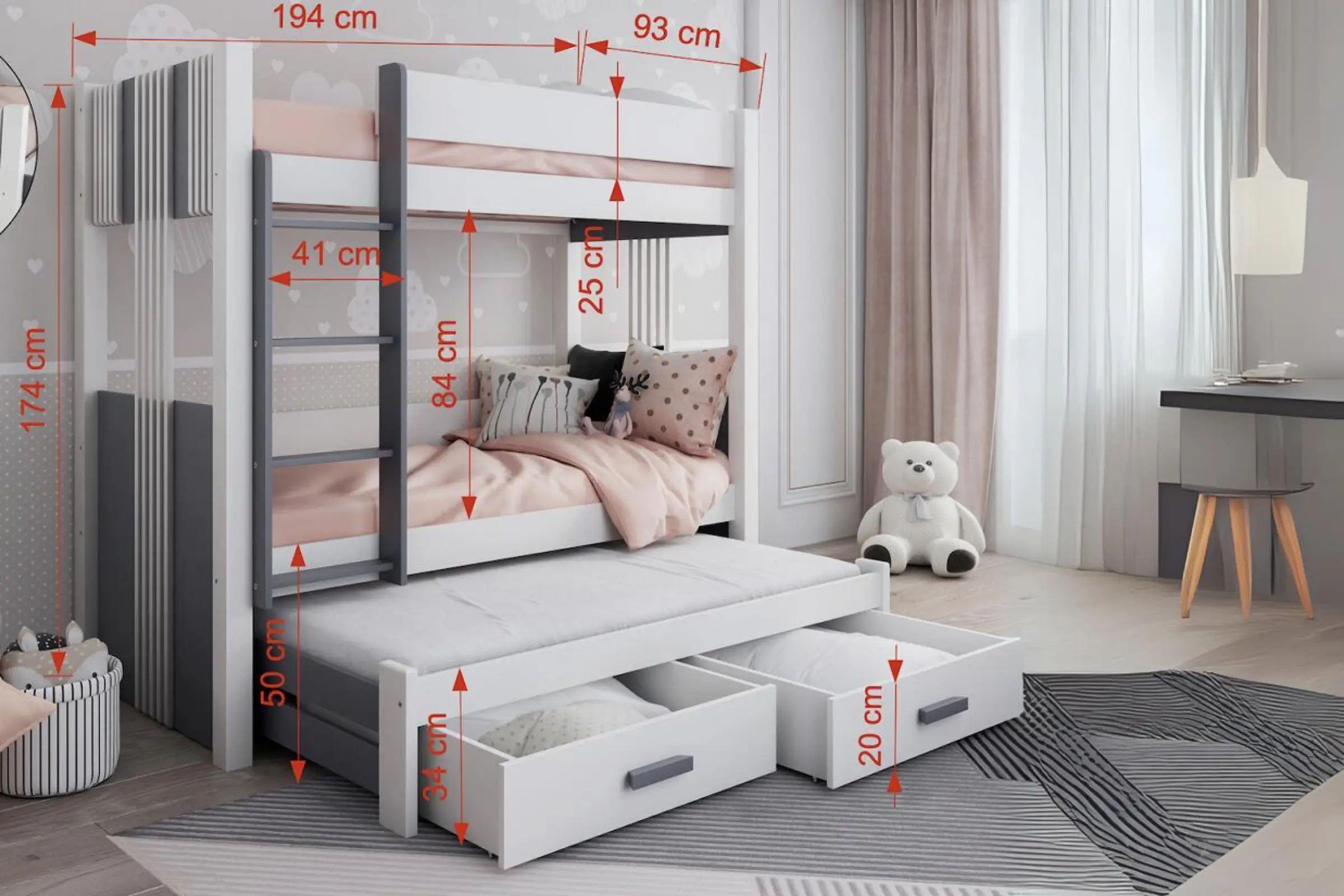 ALEXANDRA III Hochbett für Jugendliche und Kinder mit Schubkästen im modernen Design. Die Bettrahmen werden aus massivem Vollkiefernholz und die Bettelemente, wie Seitenplatten und Schubladen, aus robuster und kratzfester MDF-Platte hergestellt. Dank universellen Farben passt sich das Bett perfekt in jedes Kinderzimmer ein.