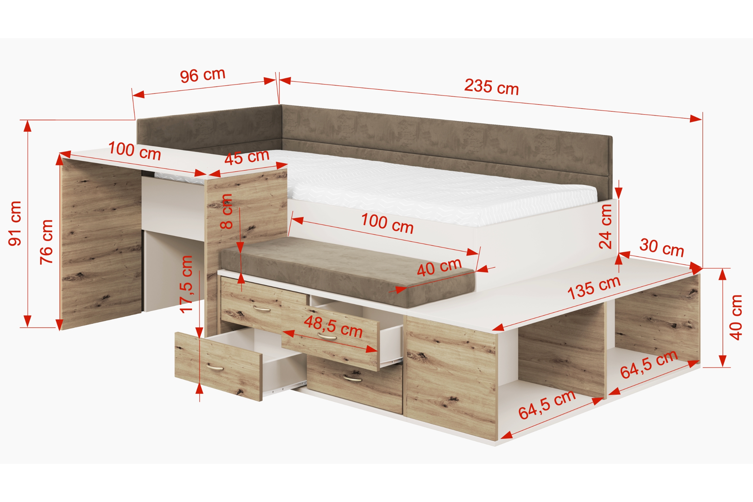Das Multifunktionsbett AMI ist die ideale Lösung für ein modernes Kinder- oder Jugendzimmer. Es verbindet Bett 90x200, Schreibtisch und Schubladen in einem kompakten Möbelstück und schafft eine strukturierte Lern- und Schlafumgebung. Perfekt für kleine Räume – maximaler Nutzen auf minimaler Fläche.