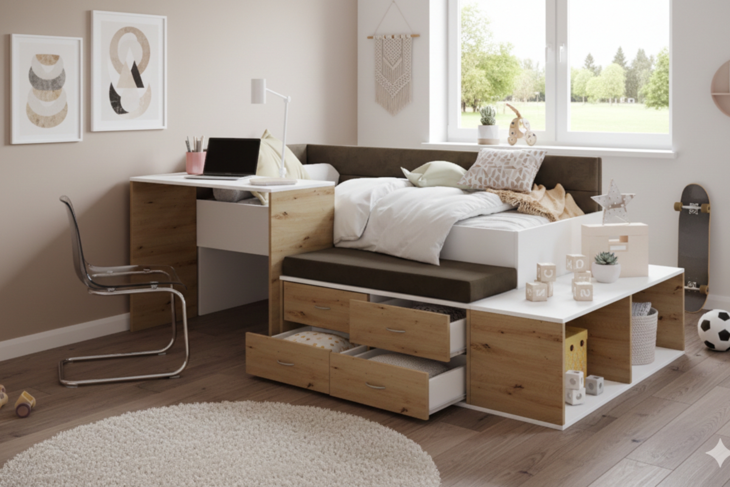Das Kinderbett AMI unterstützt Ordnung, Selbstständigkeit und Komfort im Alltag. Eine durchdachte Komplettlösung für Schlafen, Lernen und Entspannen – jetzt entdecken und Kinderzimmer funktional gestalten!