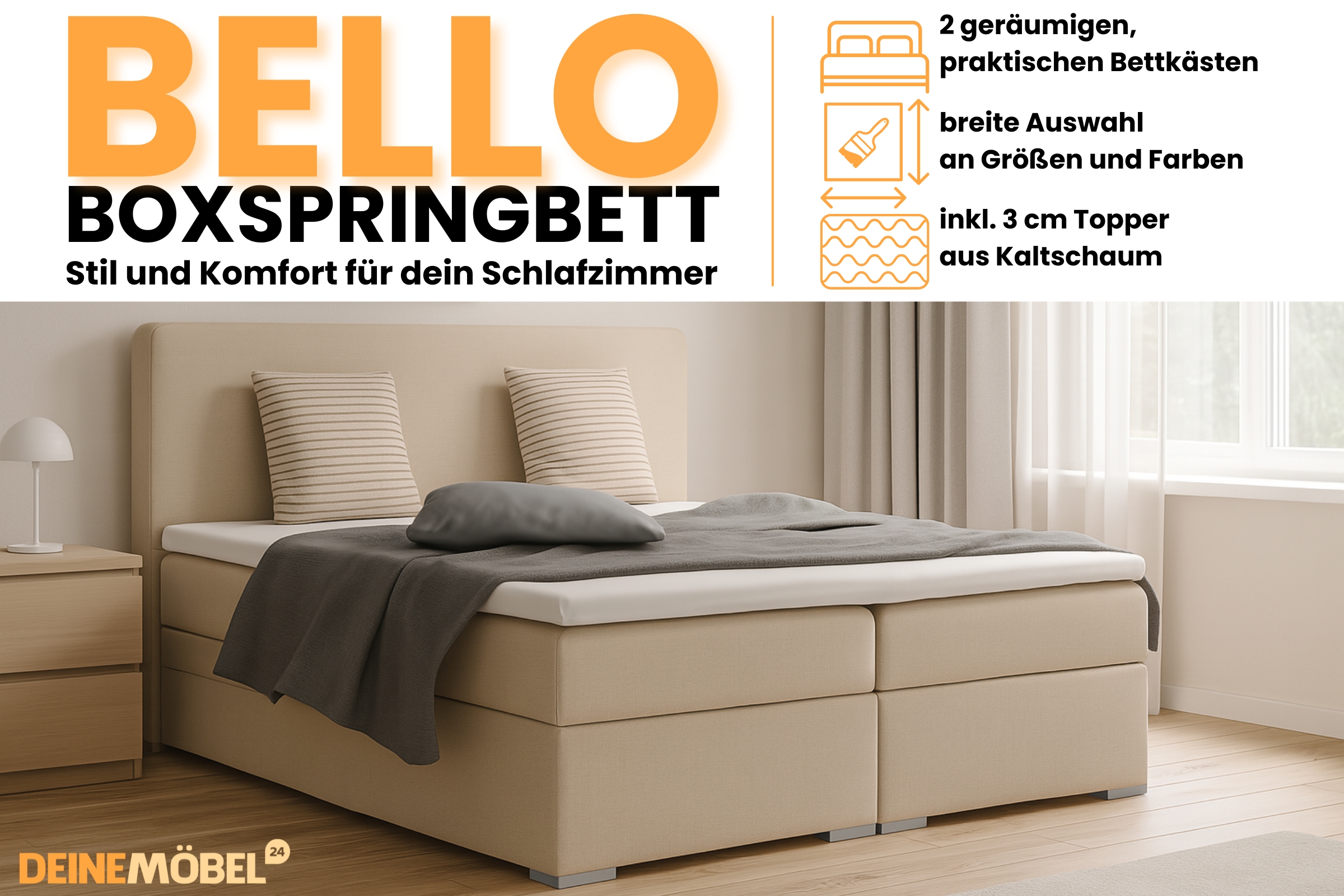 Erleben Sie traumhaften Schlafkomfort mit dem modernen Boxspringbett BELLO mit Bettkasten und Topper. Perfekt für stilvolle Schlafzimmer – funktional, bequem und in edlen Farben erhältlich.