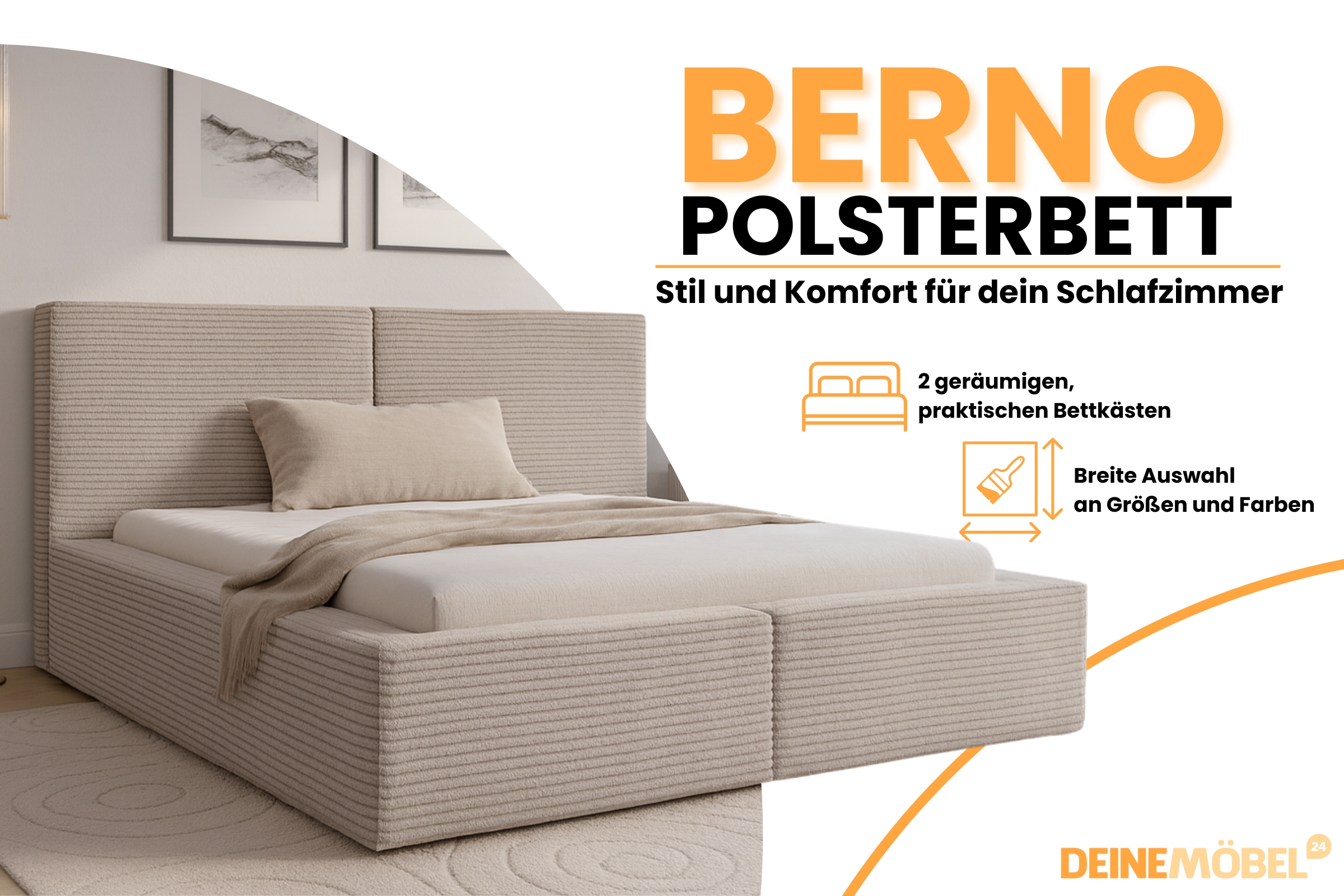 BERNO massives Polsterbett in Cord, Bouclé & Samt, inkl. Lattenrost und Bettkasten Deine Möbel