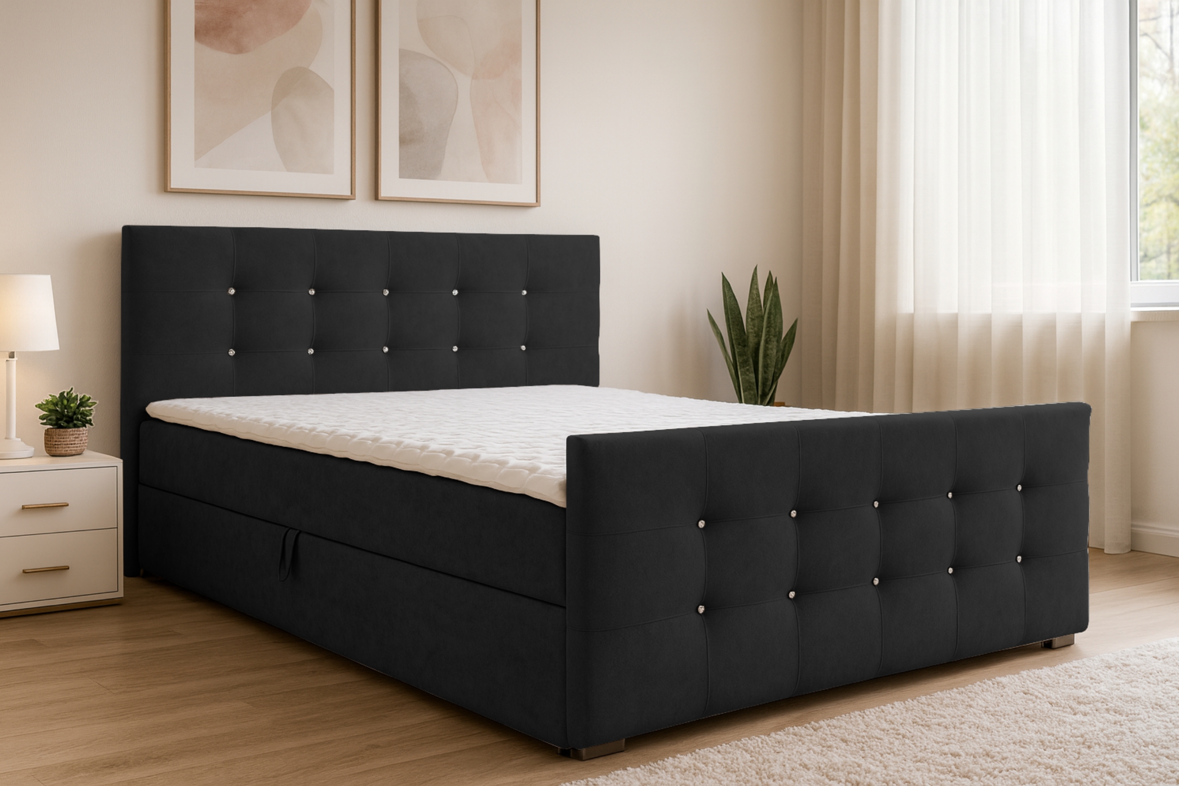 Das Boxspringbett CARMEN kombiniert ein elegantes Design mit erstklassigem Schlafkomfort. Das Kopfteil & Fußteil sind mit dekorativen Strassteinen verziert, was dem Bett eine luxuriöse Optik verleiht. Die Kombination aus Bonell-Federkernmatratze & Kaltschaum-Topper passt sich optimal dem Körper an und sorgt für einen erholsamen Schlaf.