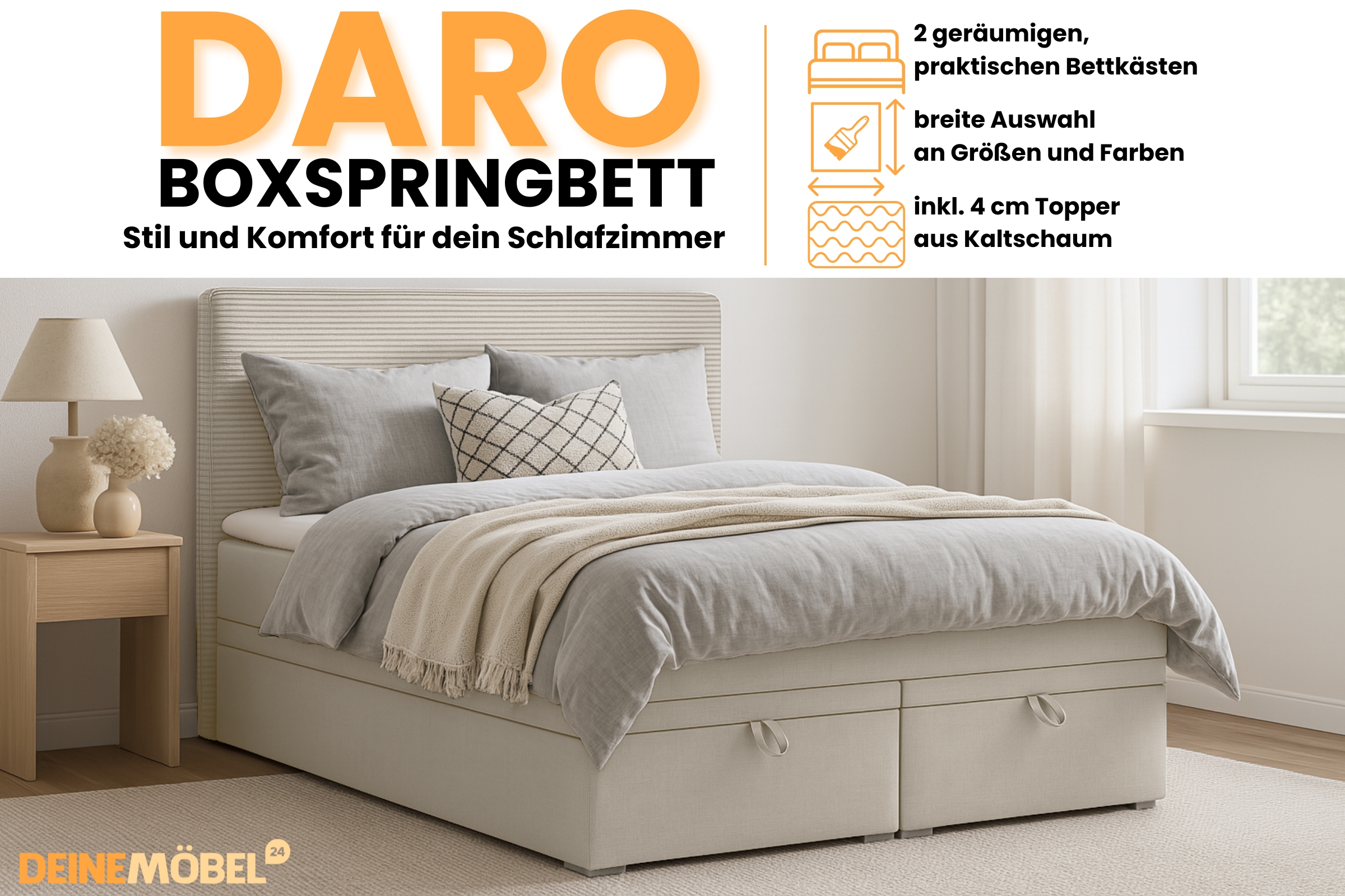 - Boxspringbett DARO in der gewählten Größe und Farbe