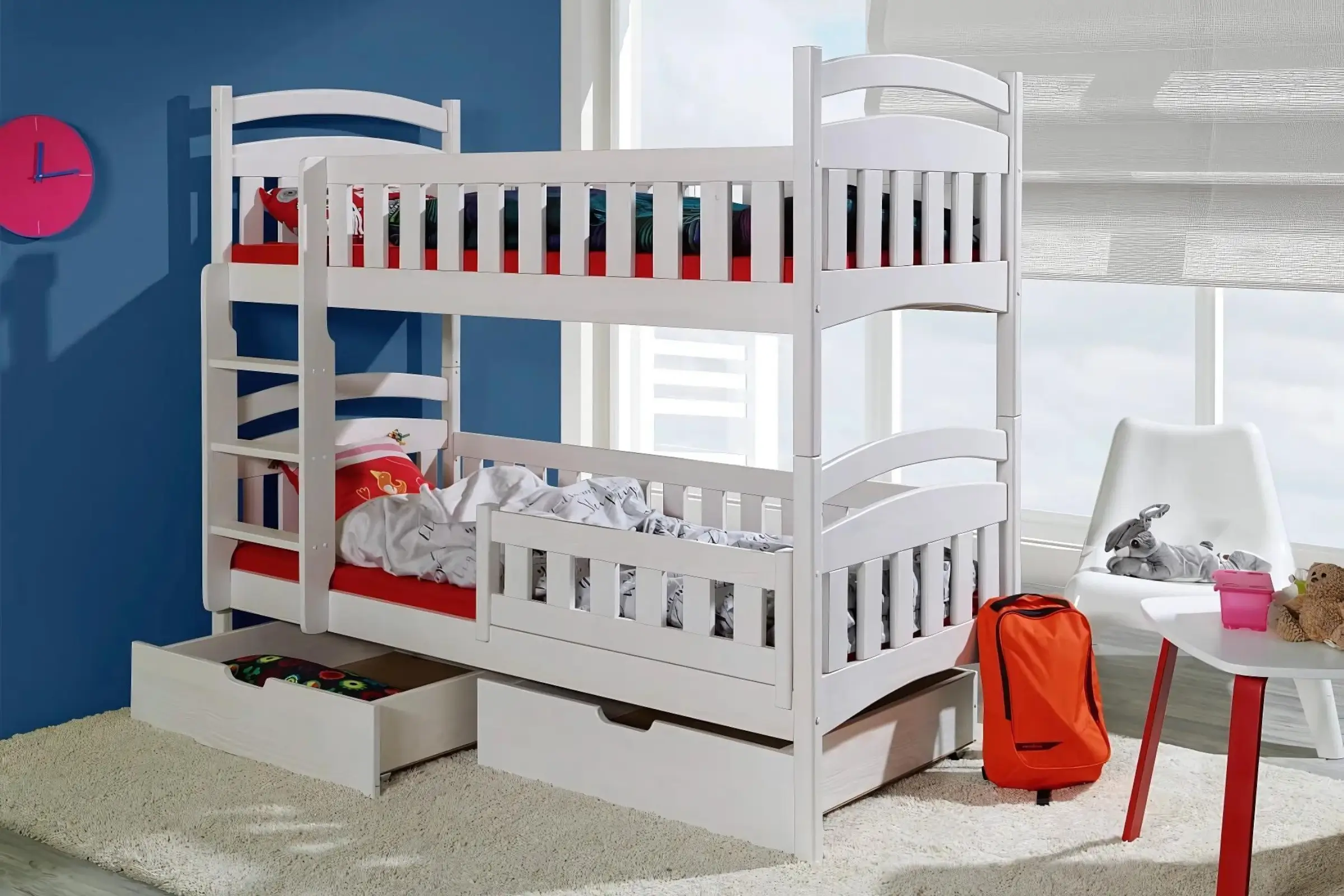 Das DAVI II Etagenbett ist die ideale Wahl für Familien mit zwei Kindern, die eine platzsparende und sichere Schlaflösung suchen. Hergestellt aus stabilem Voll-Kiefernholz, bietet das Bett sowohl Langlebigkeit als auch eine hohe Belastbarkeit von bis zu 90 kg pro Schlaffläche. Die obere Etage ist durch hohe Schutzbarrieren gesichert, um maximale Sicherheit während des Schlafs zu gewährleisten. Das Bett ist mit einer stabilen Leiter ausgestattet, die links oder rechts montierbar ist, und verfügt über zwei große Schubladen mit Rollen für zusätzlichen Stauraum.