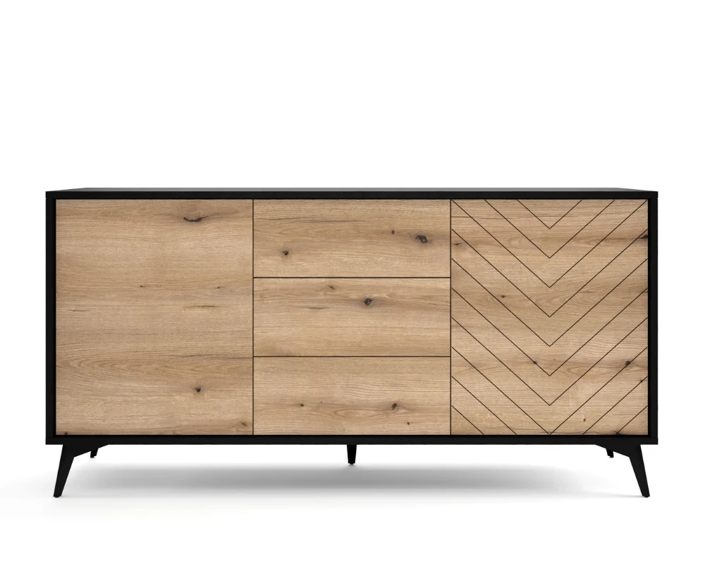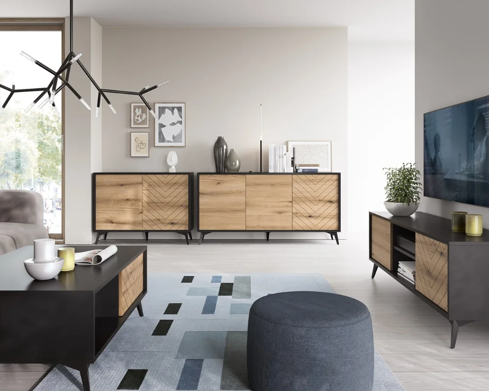 Entdecken Sie die Diamant Kollektion - perfekt für Liebhaber von Minimalismus, modernem Stil und funktionalen Möbeln. Die Kombination aus Eichenholz Evoke und Schwarz verleiht jedem Stück einen einzigartigen Charakter. Dank ihrer vielseitigen Form passen sich die Diamant-Möbel mühelos jedem Wohnzimmer an, sei es modern, loftartig oder klassisch. Besonders hervorzuheben sind die geriffelte Fronten, die Originalität und Eleganz verleihen. Durch ihre Montage auf Metallfüßen sind die Einheiten leicht zu pflegen und visuell leichter. Tauchen Sie ein in die Welt der Diamond Kollektion und erleben Sie zeitlose Eleganz und Funktionalität.