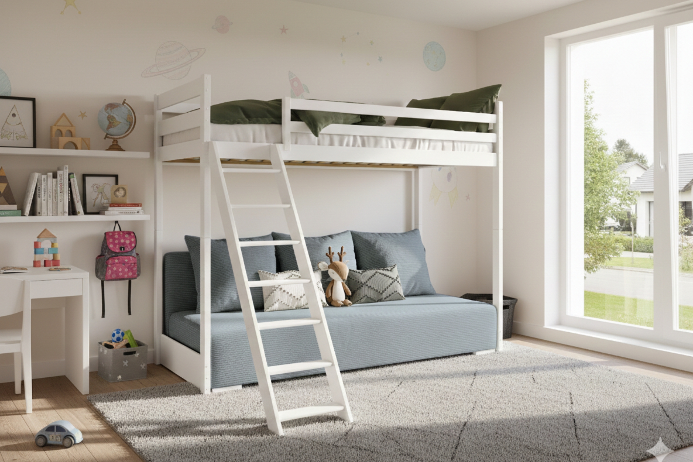Das Etagenbett SIDNEY ist die perfekte Kombination aus modernem Design, Sicherheit und Alltagstauglichkeit. Mit seinem durchdachten Aufbau bietet es tagsüber eine gemütliche Sofalösung und verwandelt sich nachts in ein komfortables Bett für Gäste oder Familienmitglieder. Ideal für Kinder-, Jugend- oder Gästezimmer – dieses multifunktionale Möbelstück nutzt jeden Zentimeter optimal aus.