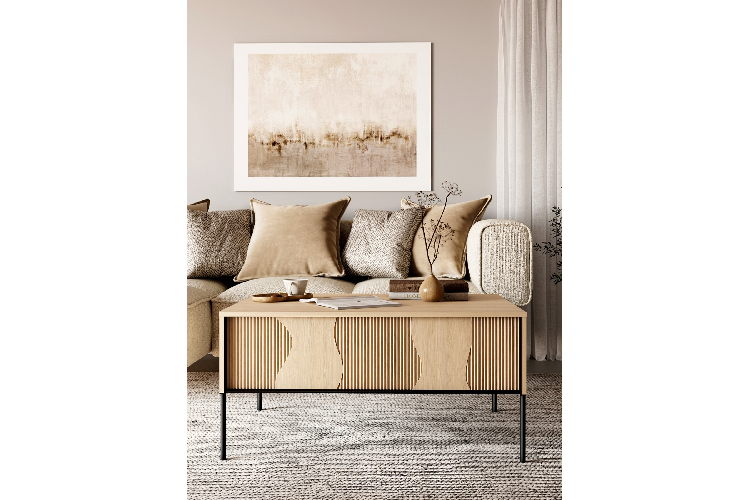 Couchtisch FAVOS 06 – 100 cm breit, moderner Wohnzimmertisch mit Stauraum, Klappe, geriffelter Front, Eiche/Schwarz