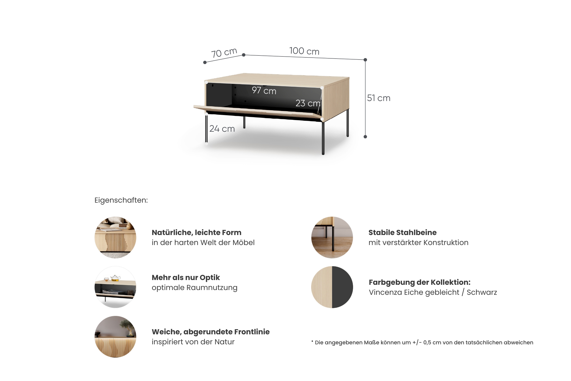 Der Couchtisch FAVOS 06 vereint stilvolles Design mit durchdachter Funktionalität und wird schnell zum Blickfang in Ihrem Wohnzimmer. Die elegante Kombination aus Eiche Vincenza hell und Schwarz verleiht Ihrem Zuhause eine warme, moderne Atmosphäre. Dank praktischem Stauraum unter der Klappe sorgt der Tisch gleichzeitig für Ordnung und Komfort im Alltag.