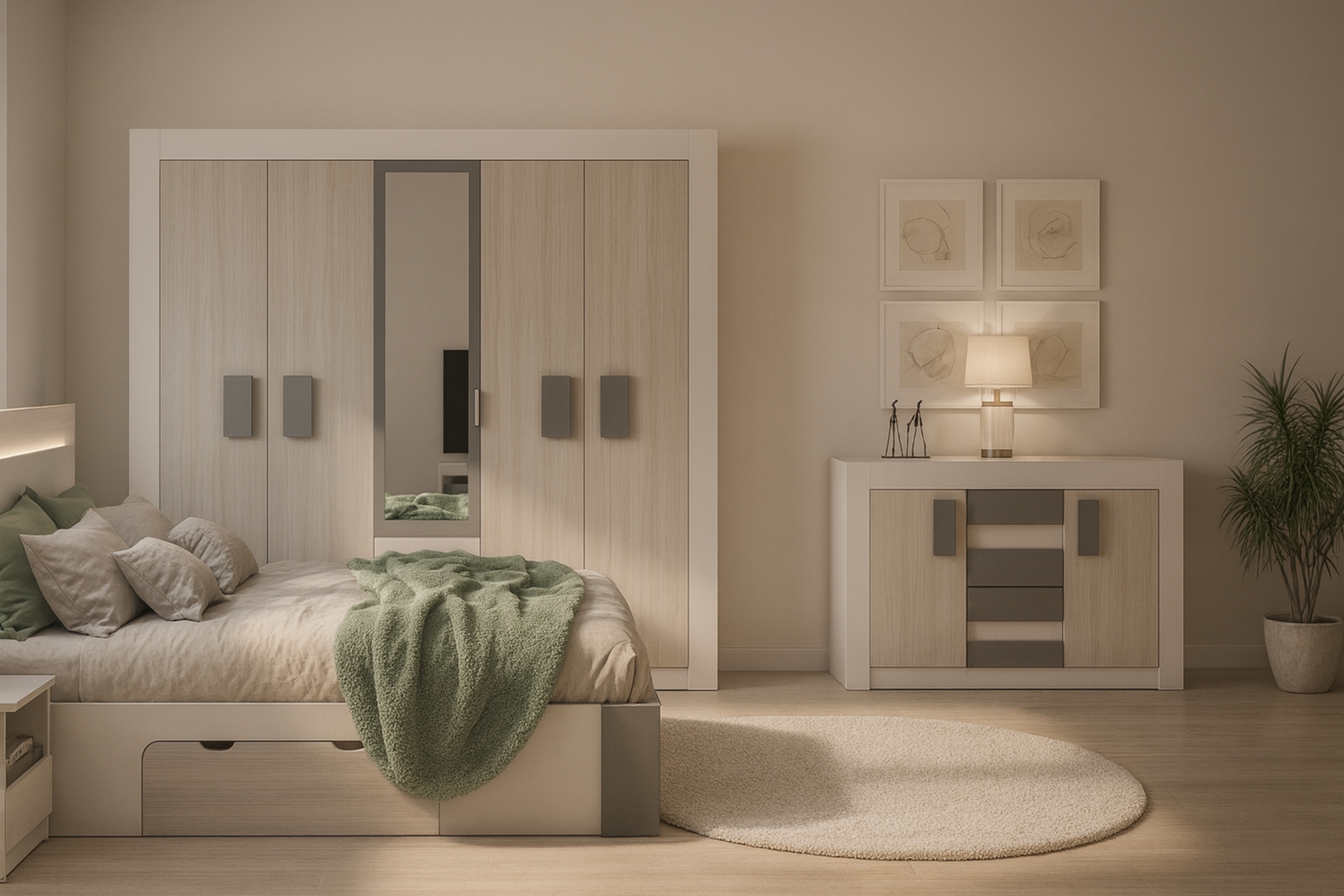 Die moderne Kombination aus weißer Front und Holzstruktur verleiht dem Tisch eine warme, elegante Ausstrahlung. Gefertigt aus robuster laminierter Platte mit ABS-Kanten, ist der Nachttisch pflegeleicht, langlebig und ideal für den täglichen Gebrauch geeignet.