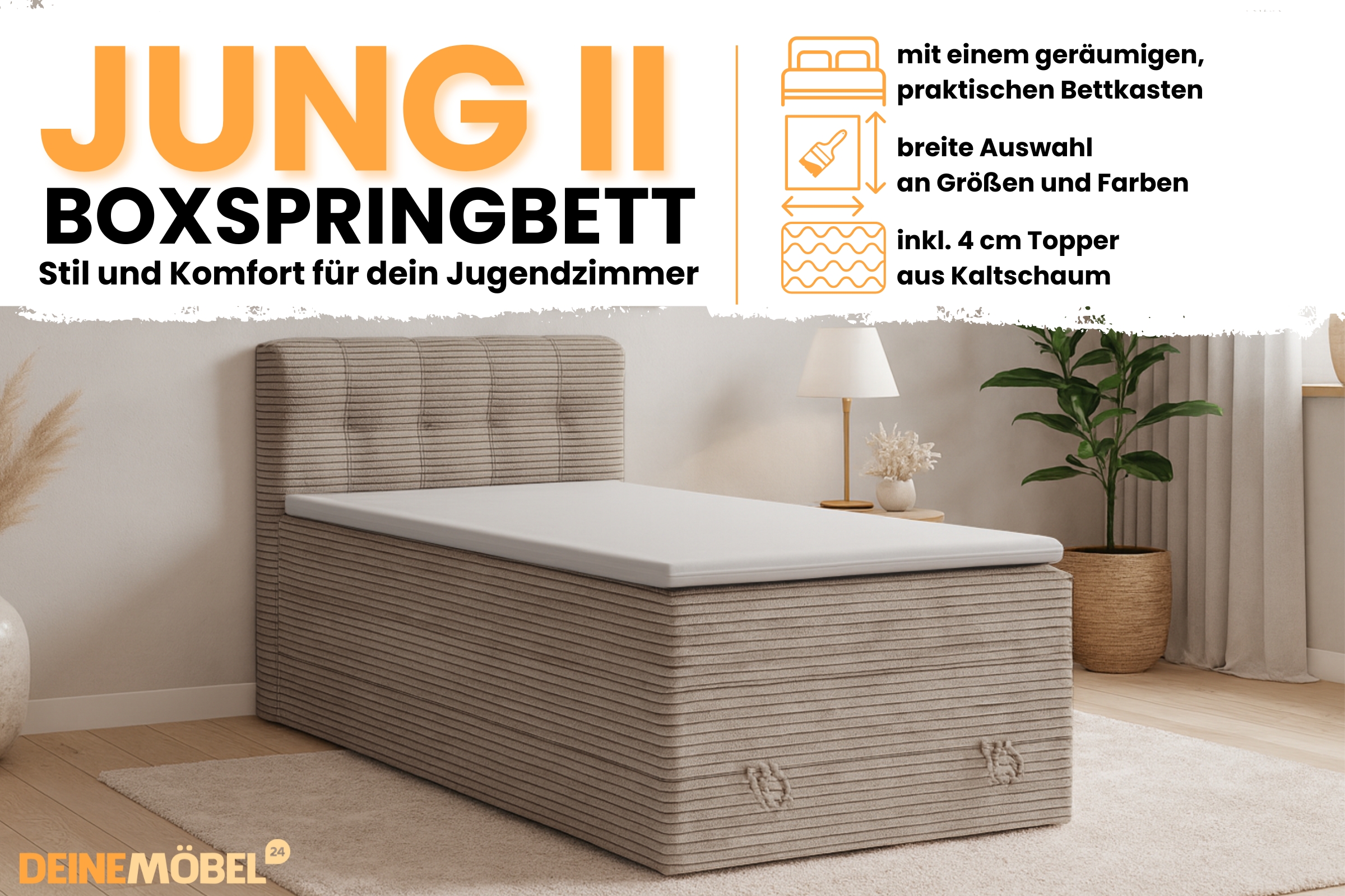 Unser JUNG 2 Boxspringbett in modernem Cord-Stoff ist praktisch, modern und zeitlos. Dank dem vorne aufklappbaren Bettkasten lassen sich hier Kissen und Decken problemlos und einfach verstauen. Mit unserem Boxspringbett JUNG 2 können Sie Ihr Schlafzimmer platzsparend und modern einrichten.