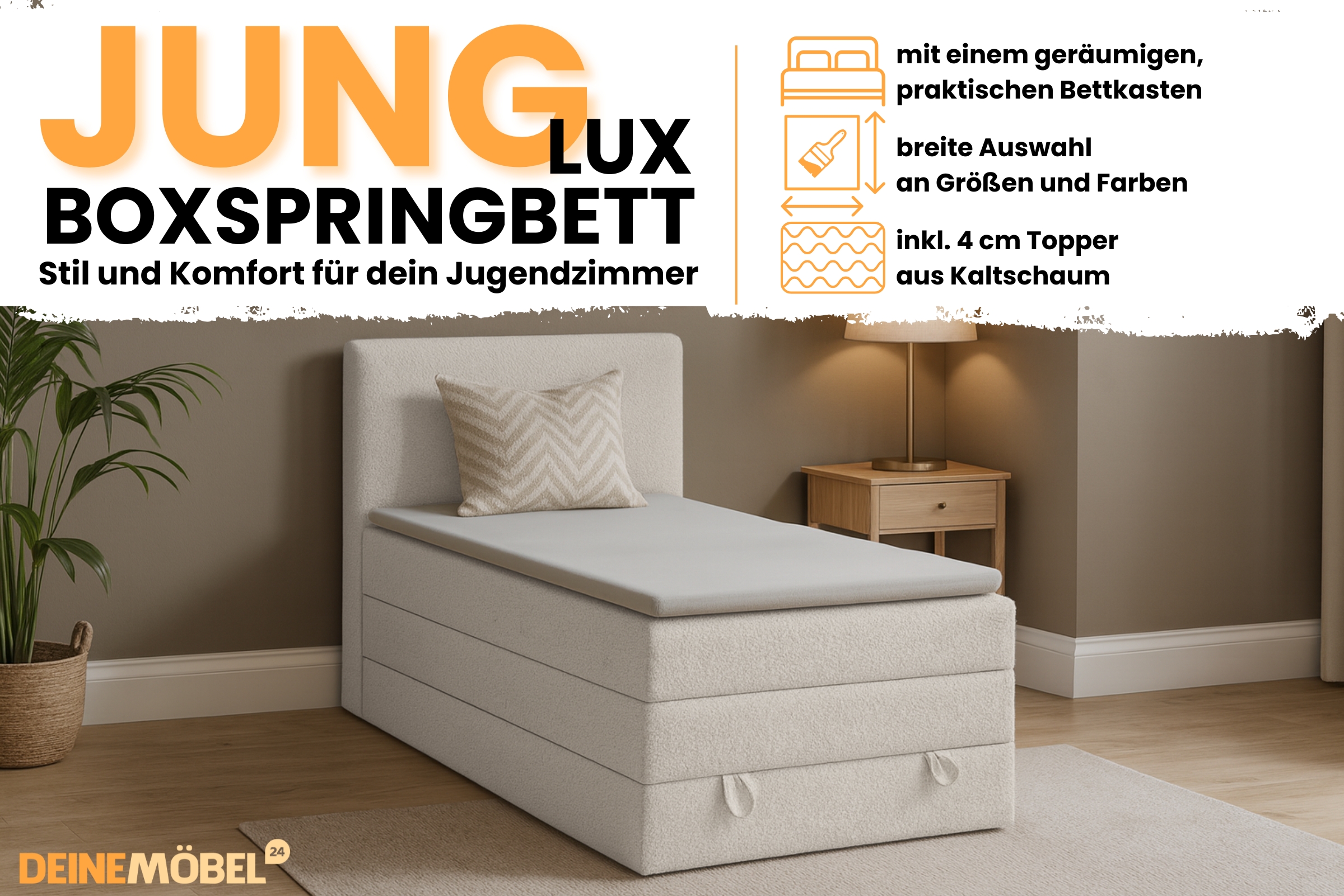 Das Boxspringbett JUNG LUX bietet Ihnen perfekten Schlafkomfort und ein modernes Design mit praktischem Stauraum. Dank seines nach vorne aufklappbaren Bettkastens ist es ideal für kleine Schlafzimmer, Jugendzimmer oder Gästezimmer – platzsparend, bequem und elegant zugleich.