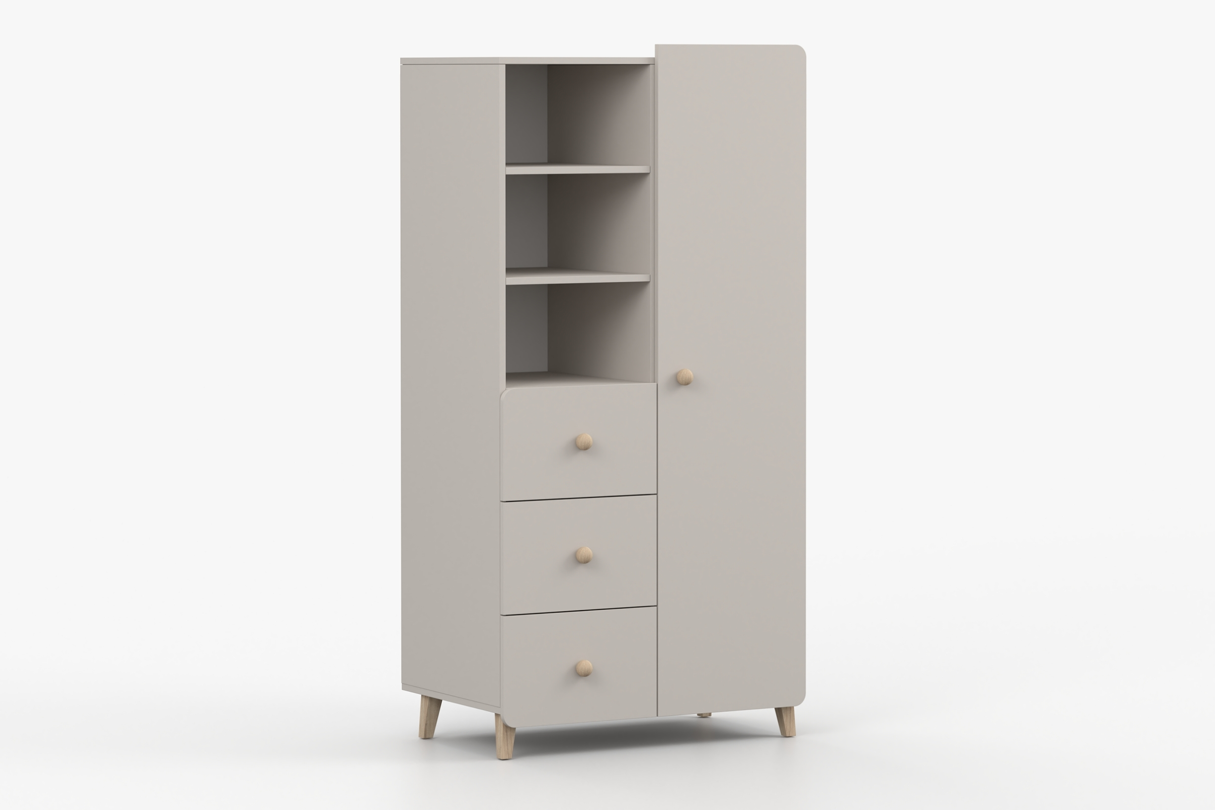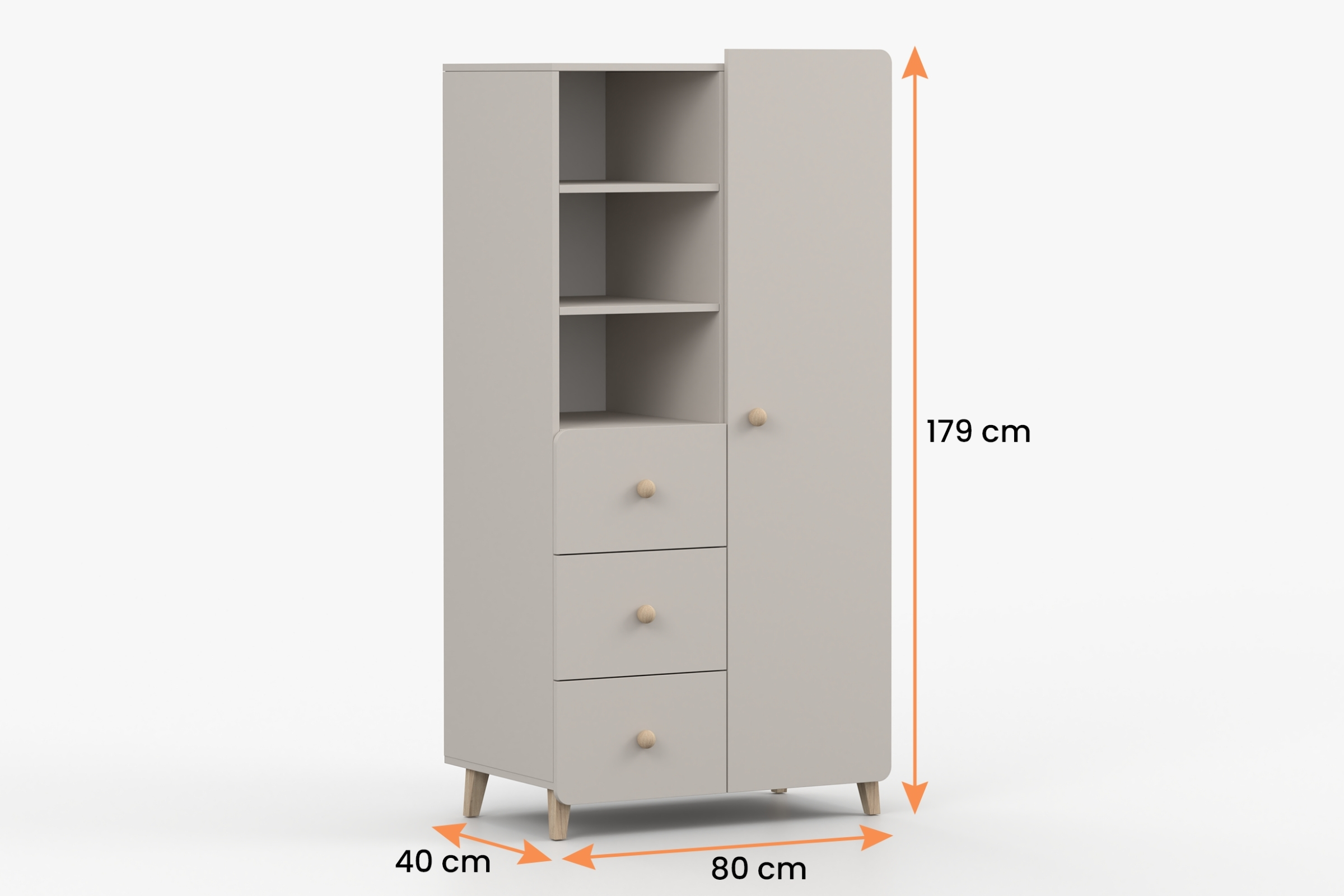 Die Farbe Kaschmir, runde Holzgriffe, Holzfüße und abgerundete Fronten verleihen den Möbeln eine freundliche und harmonische Optik. So entsteht ein einheitlich eingerichteter Raum mit viel Platz für Kleidung, Schulmaterial, Bücher und Alltagsgegenstände.