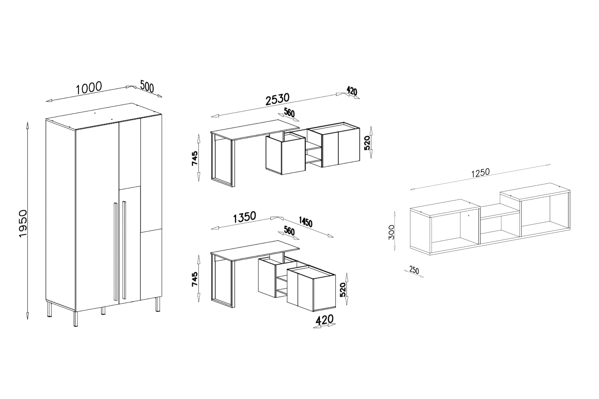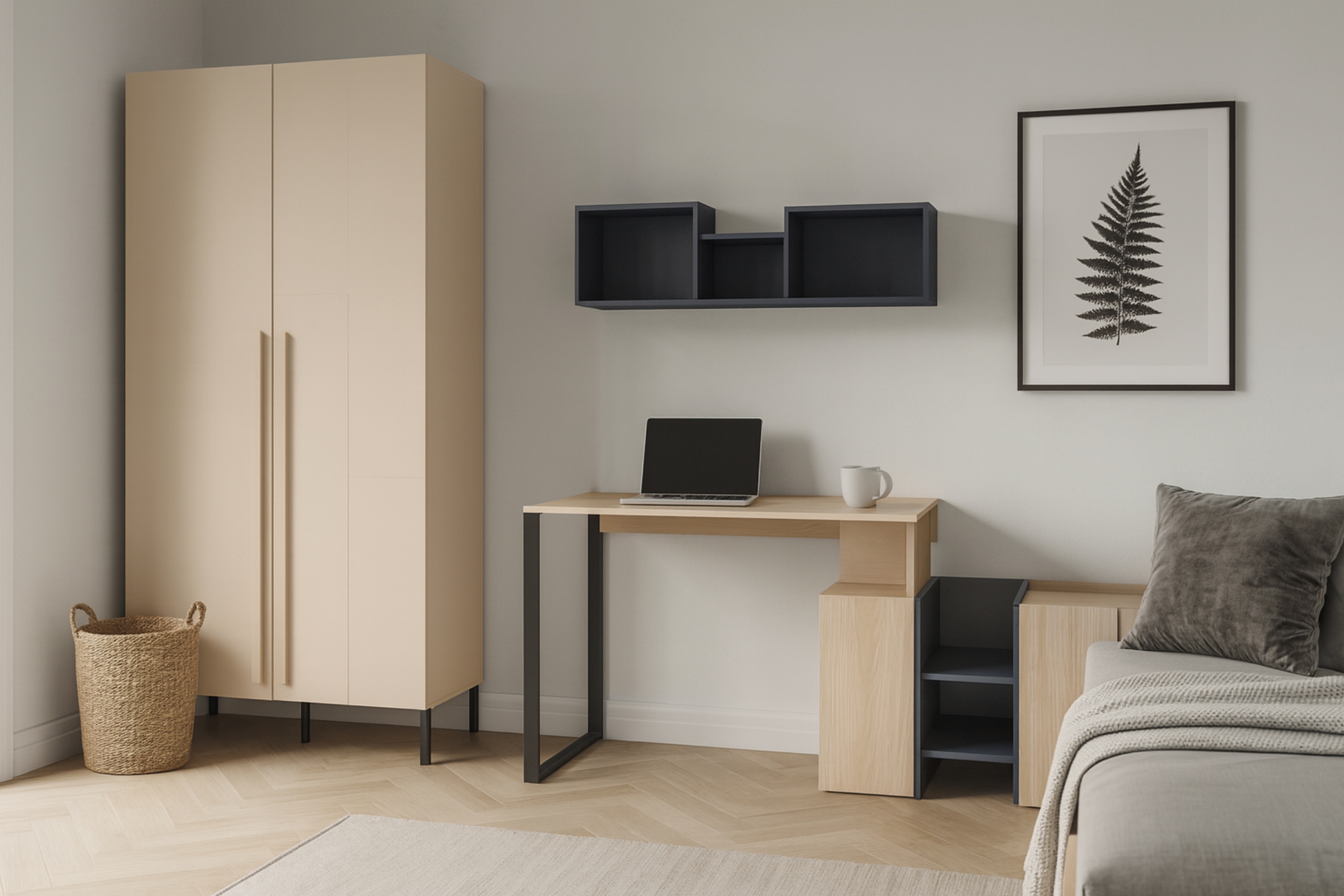 Das Set besteht aus einem geräumigen Kleiderschrank, einem funktionalen Schreibtisch und einer stilvollen Wandregal – perfekt für Lernen, Ordnung und Alltag.