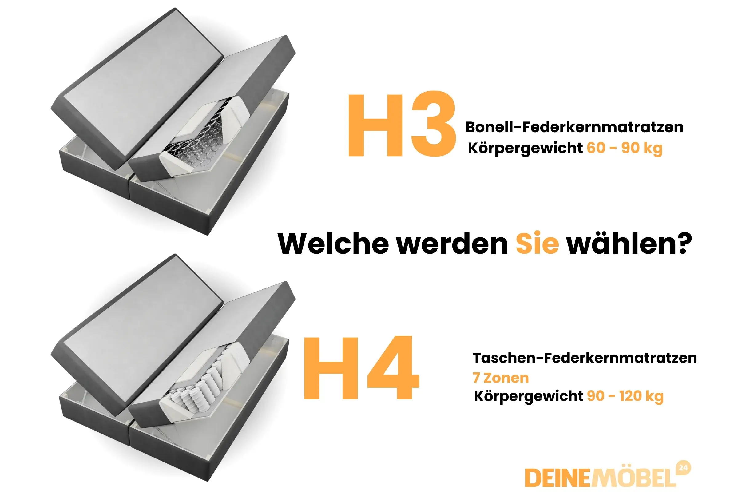 - Zwei Bonell Federkernmatratzen H3 oder wahlweise 7-Zonen Taschenfederkernmatratzen H4 für perfekte Körperanpassung und Stütze
