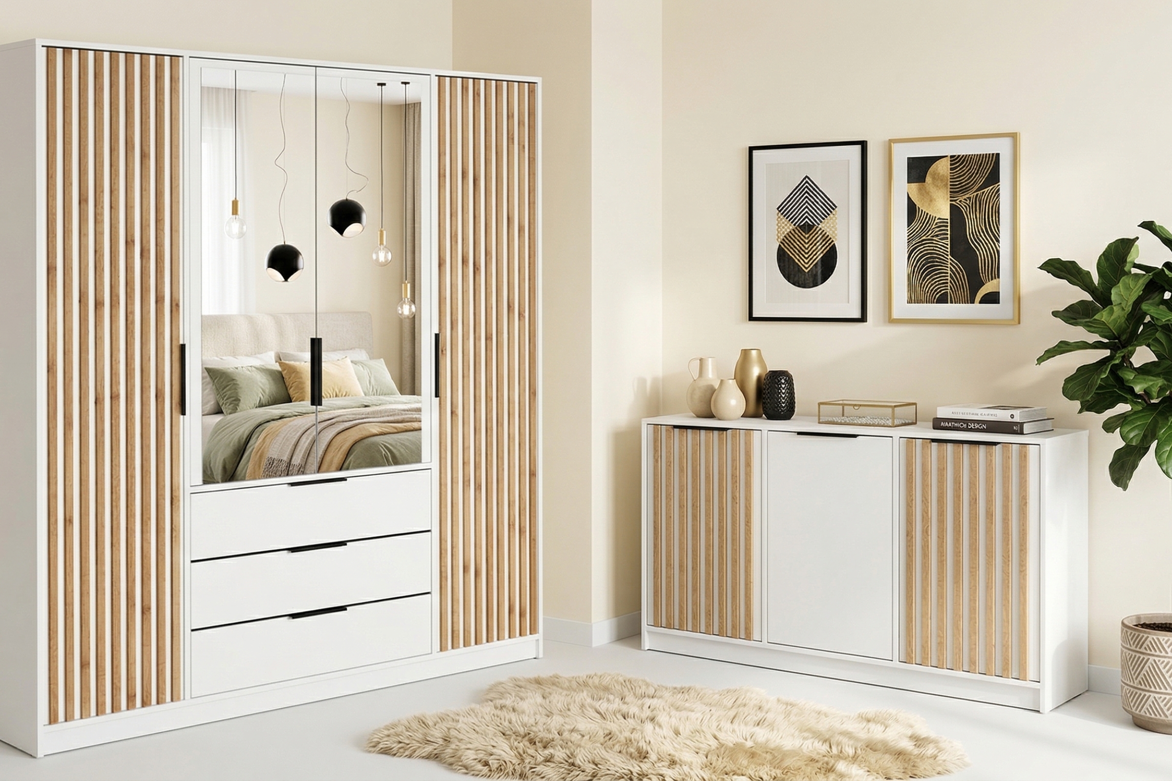 Modern, großzügig und stilvoll: Dieses Schlafzimmer-Set mit Kleiderschrank und Kommode verbindet trendige Lamellenoptik, große Spiegelfronten, warme Eiche-Wotan-Optik und viel Stauraum. Ideal für alle, die ein modernes Schlafzimmermöbel-Set, ein elegantes Garderoben-Set oder praktische Stauraummöbel in Holzoptik suchen.