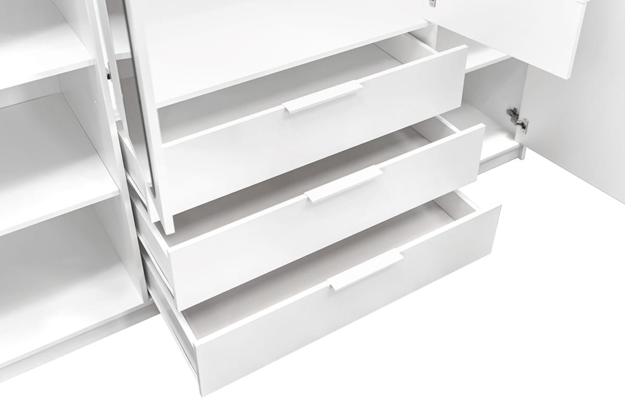 Die Kommode LABOO LUX D3 ergänzt das Set perfekt. Hinter 3 Türen und auf 3 Einlegeböden entsteht zusätzlicher Stauraum für Textilien, Dokumente oder Alltagsgegenstände. Ideal für Schlafzimmer, Flur, Diele, Wohnzimmer oder Ankleidezimmer.