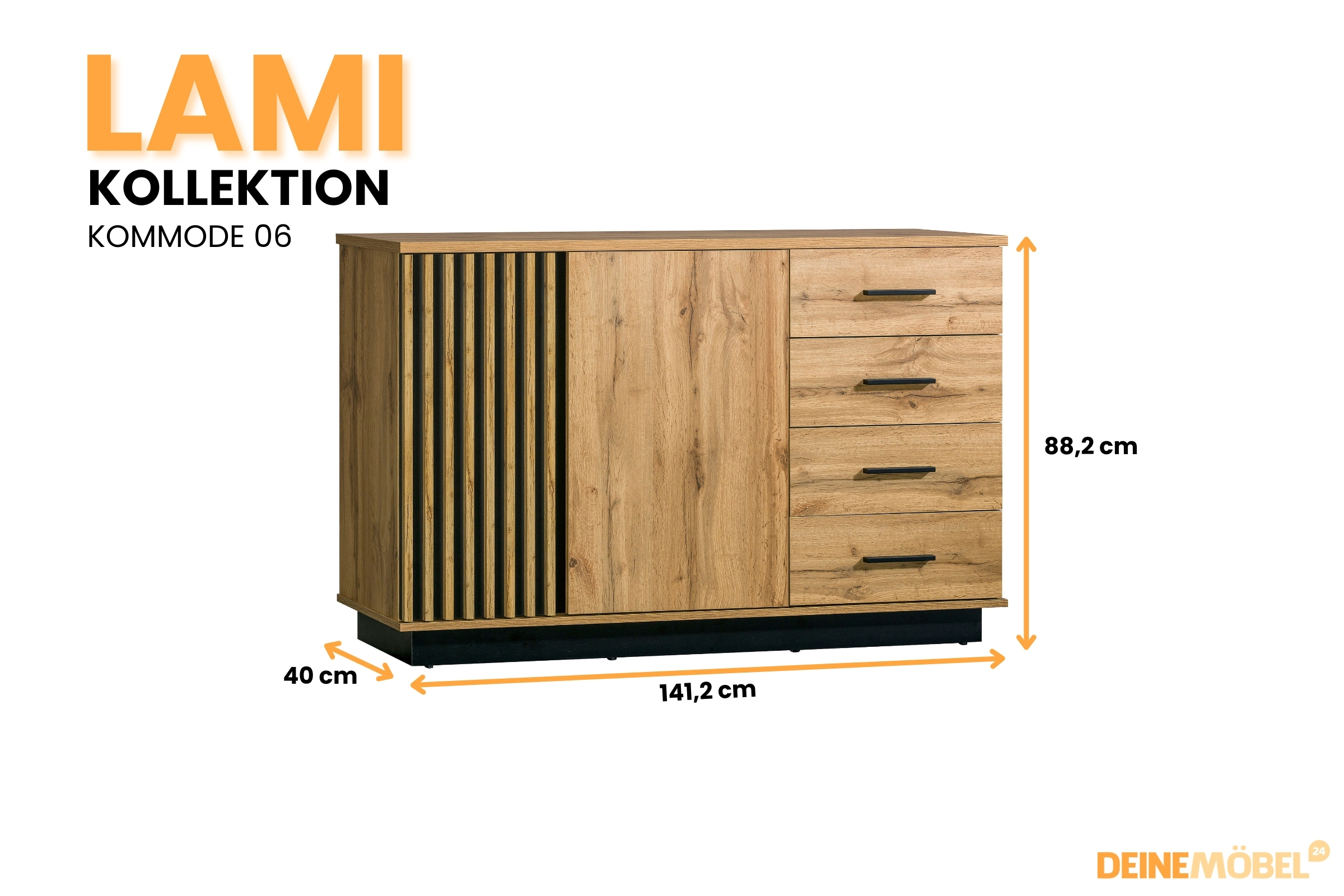 Das Möbelset LAMI D vereint zeitloses Design, moderne Funktionalität und höchsten Komfort – perfekt für die Einrichtung eines Schlafzimmers, Jugendzimmers oder auch eines stilvollen Wohnraums. Die trendige Kombination aus natürlichem Wotan Eiche Dekor, mattschwarzen Elementen und dekorativen Lamellen sorgt für eine warme, wohnliche Atmosphäre mit Loft-Charakter. Mit LAMI schaffen Sie Räume, die sowohl praktisch als auch gemütlich sind.