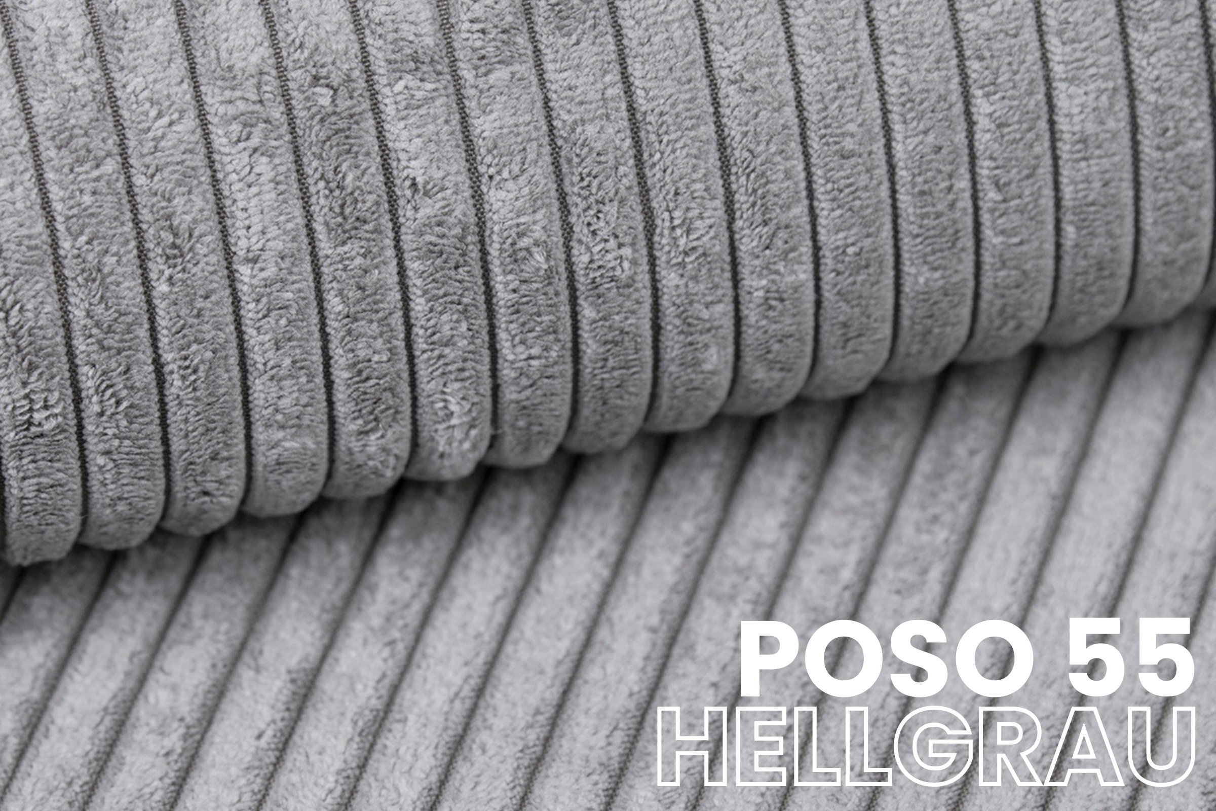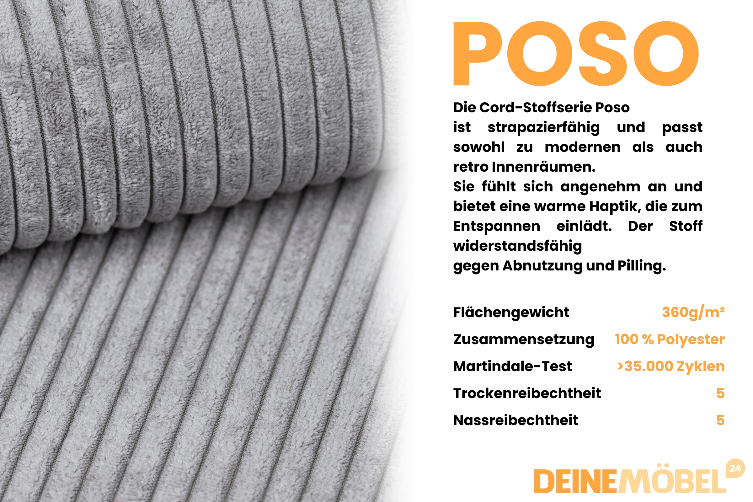 Cord-Stoff Poso: wird als Veloursstoff eingestuft. Es handelt sich um ein plüschiger Stoff mit kurzem Haar. Der Stoff zeichnet sich durch seine samtig feine Oberfläche. Stoff Poso ist aus 100 % Polyester mit höherem Gewicht 380 g/m2 hergestellt. Sein typischer Eindruck sieht als Cord-Stoff aus. Dieser Stoff zeichnet sich durch seine Festigkeit und Widerstandsfähigkeit aus. Wir empfehlen den Stoff mit einem feuchten Lappen und Seifenwasser oder mit speziellen Reinigungsmitteln für Polstermöbel zu reinigen.