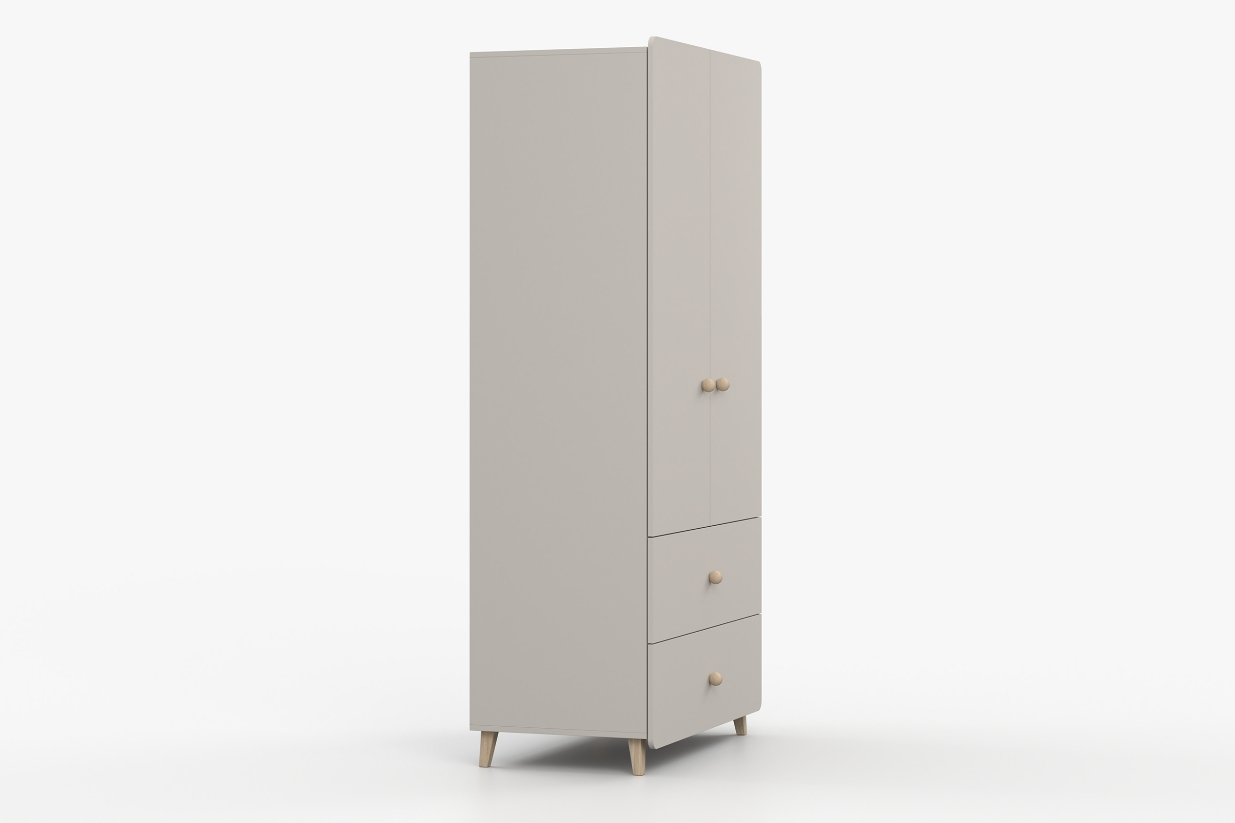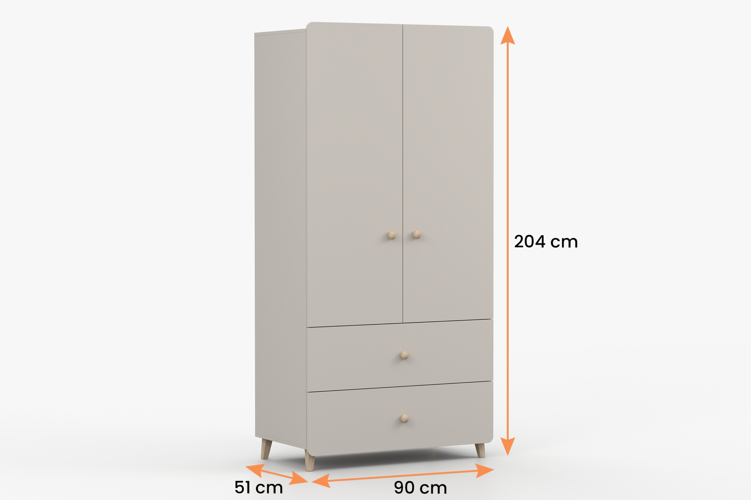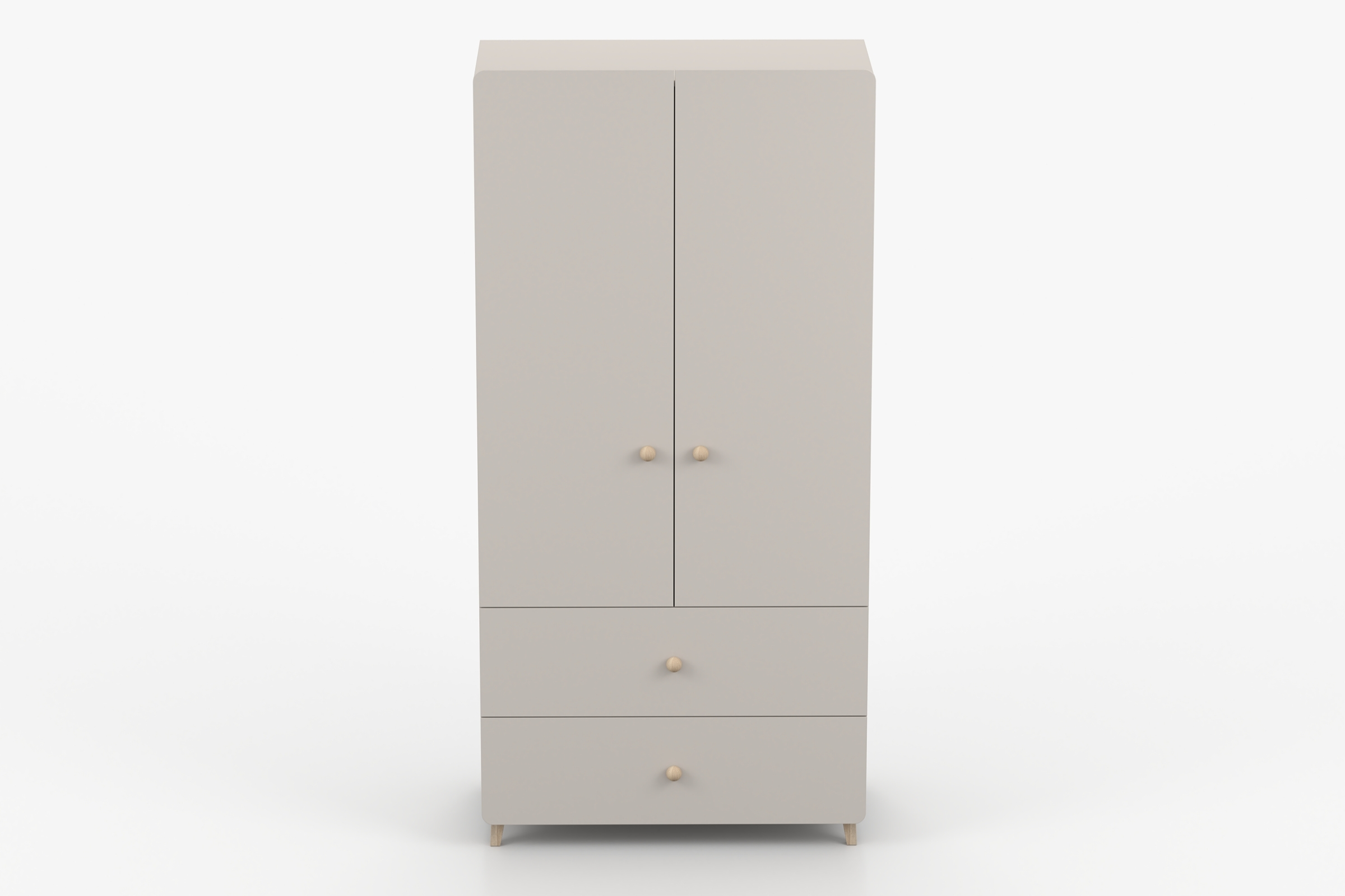 Die Farbe Kaschmir, runde Holzgriffe, Holzfüße und die abgerundeten Fronten verleihen dem Schrank eine freundliche, wohnliche Optik. So passt er ideal zu modernen und gemütlichen Einrichtungen.