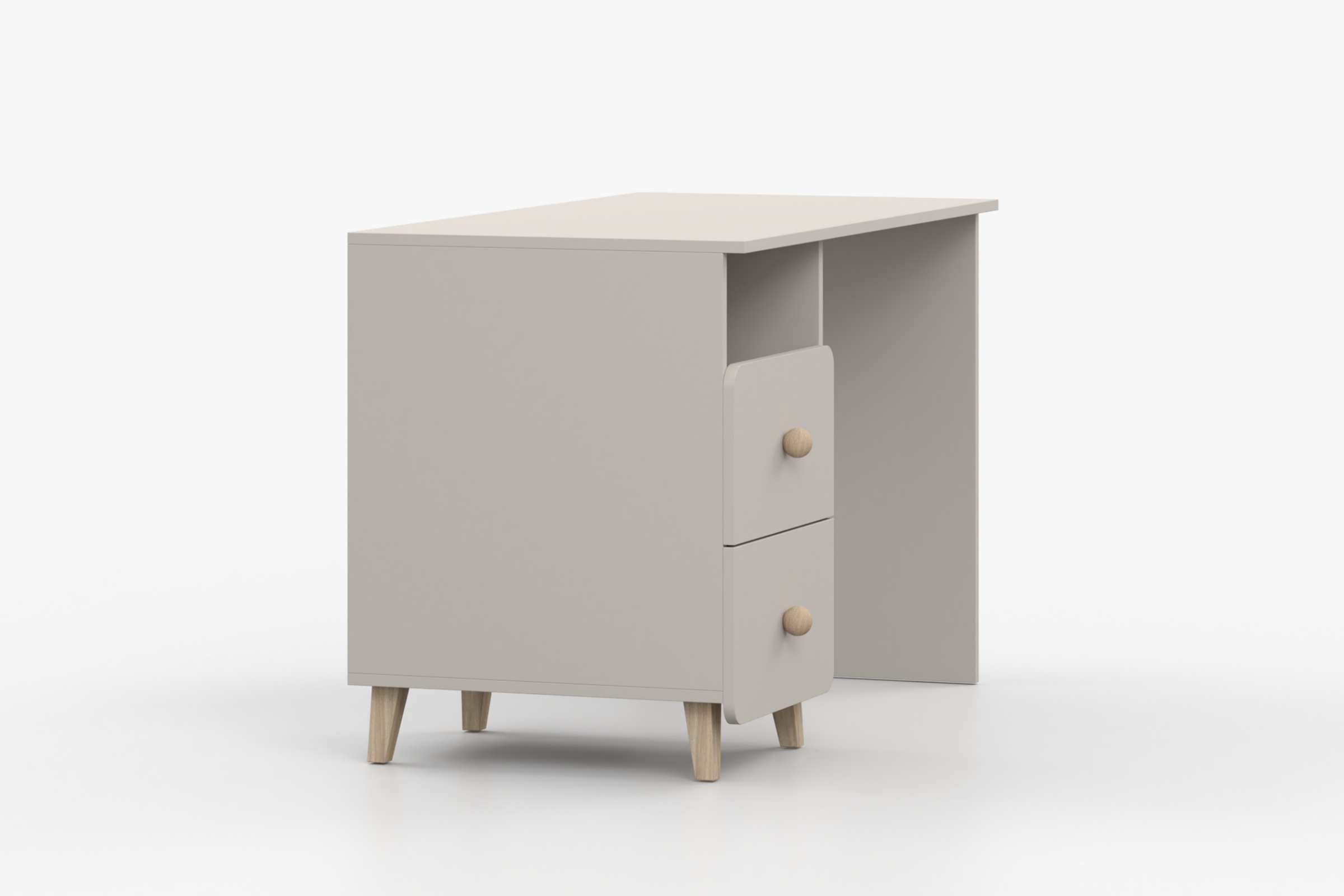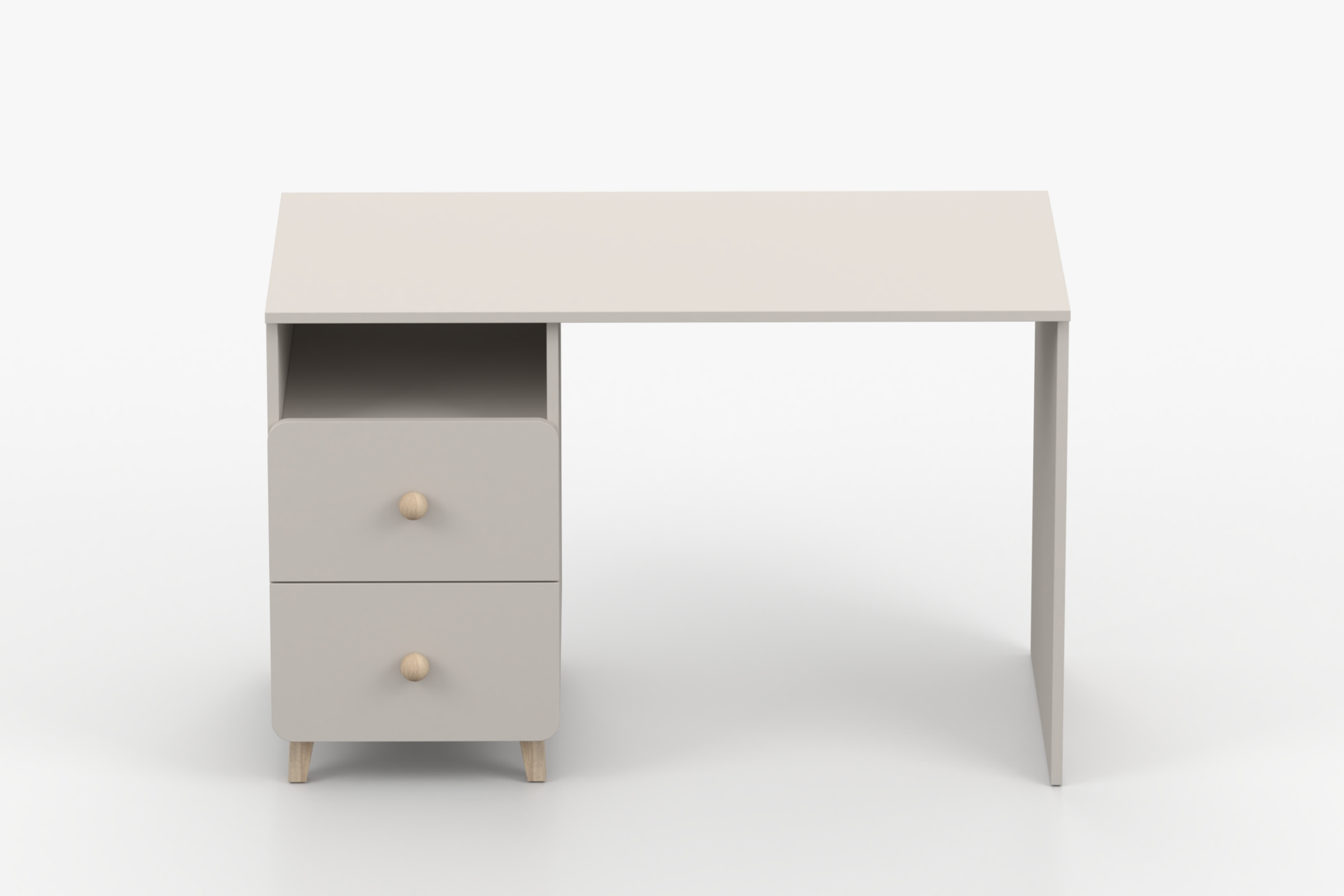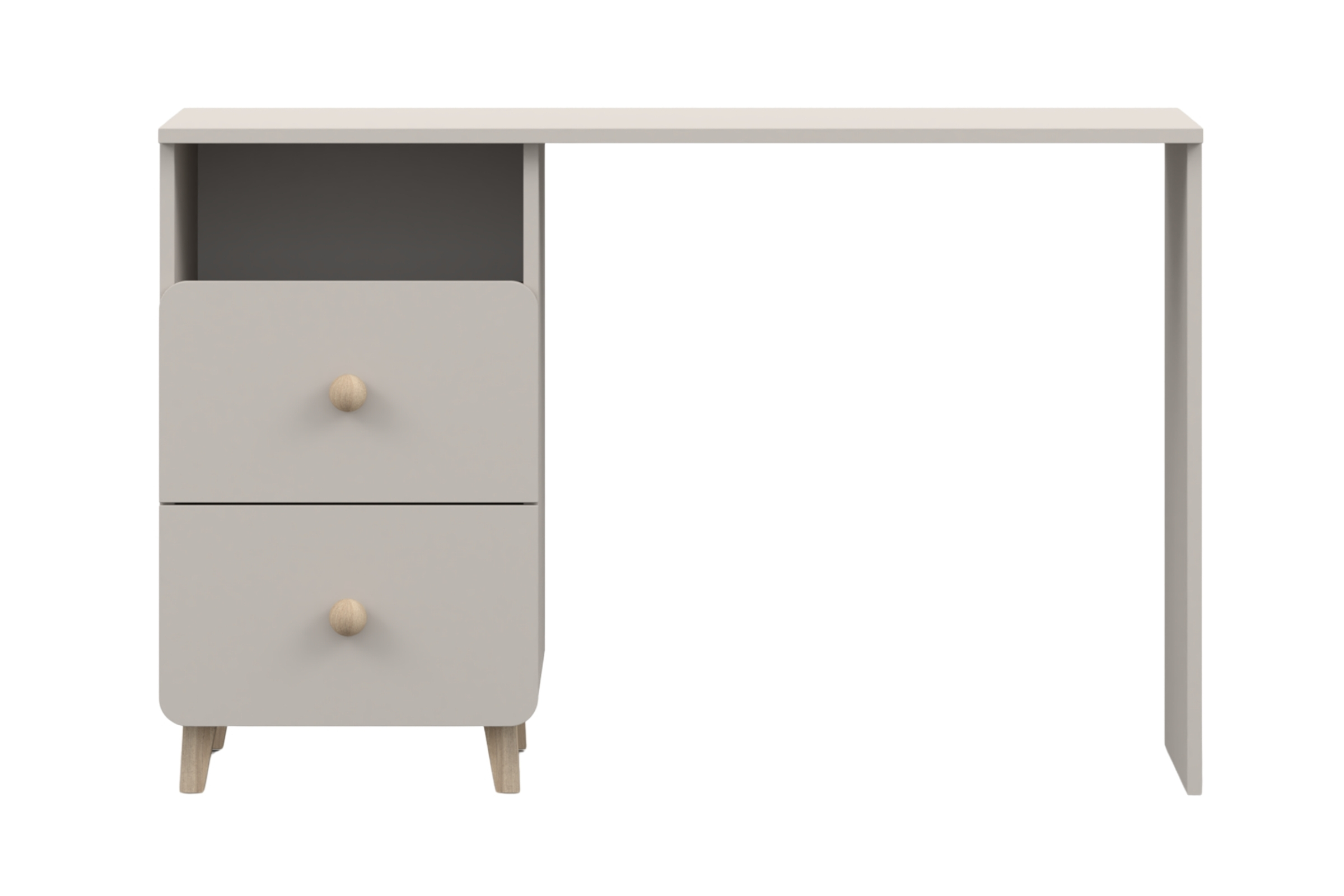 Die Farbe Kaschmir, runde Holzgriffe, Holzfüße und die abgerundeten Fronten verleihen dem Schreibtisch eine leichte und freundliche Optik. Dadurch passt er ideal in Kinderzimmer, Jugendzimmer oder einen modernen Arbeitsbereich.