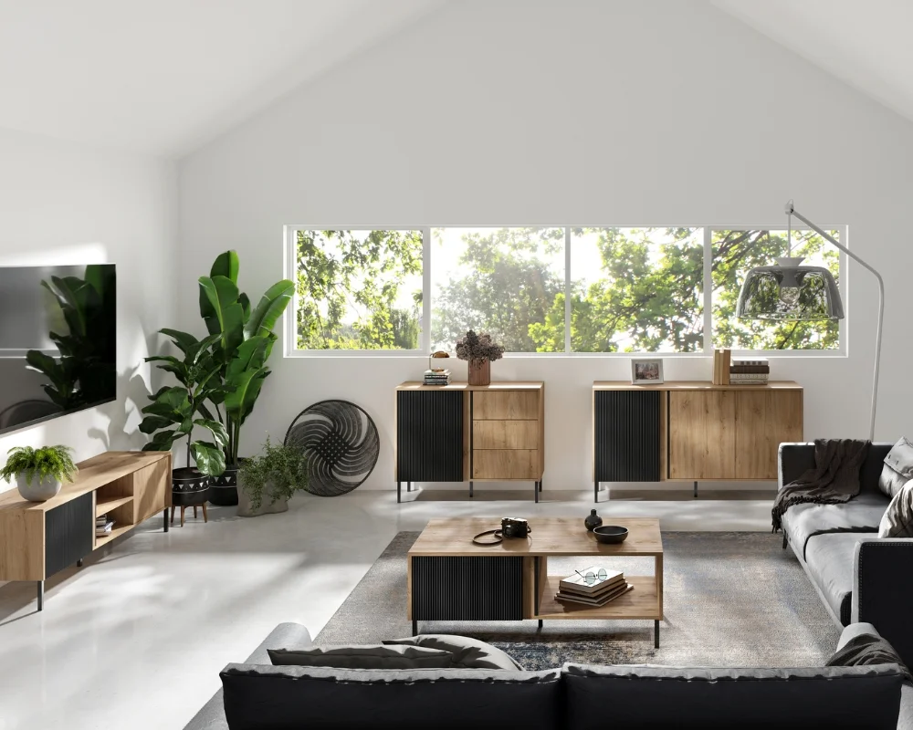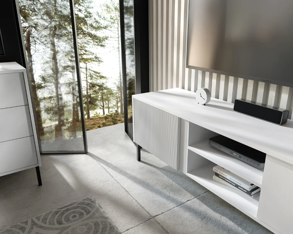 Möbel MEDIOLAN sind reizvolle Kombination aus geometrischen Formen und dezenten Farben. Geriffelte Fronten verleihen Finesse und Eleganz. Metallfüße unterstreichen das einzigartige Design der Möbel.