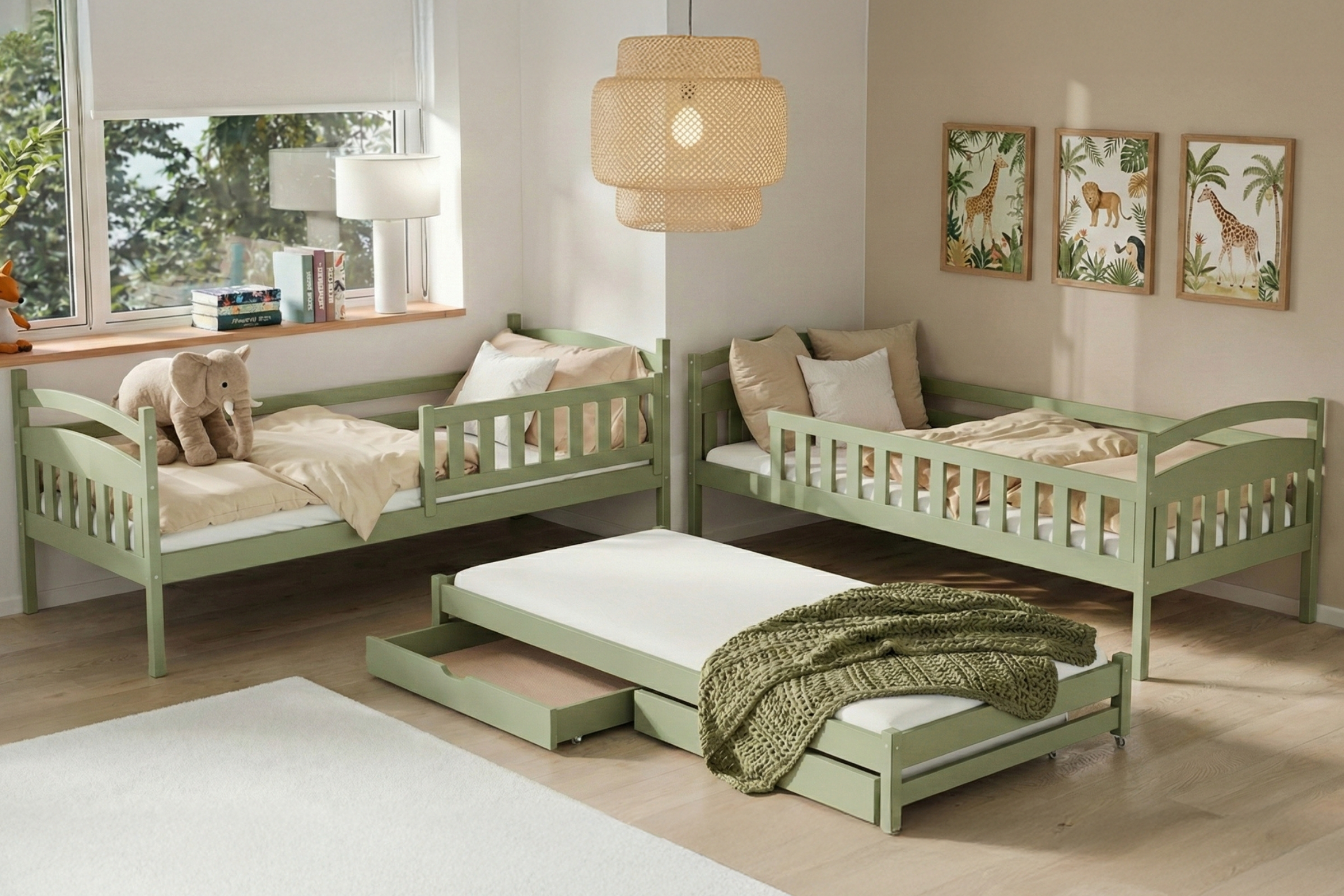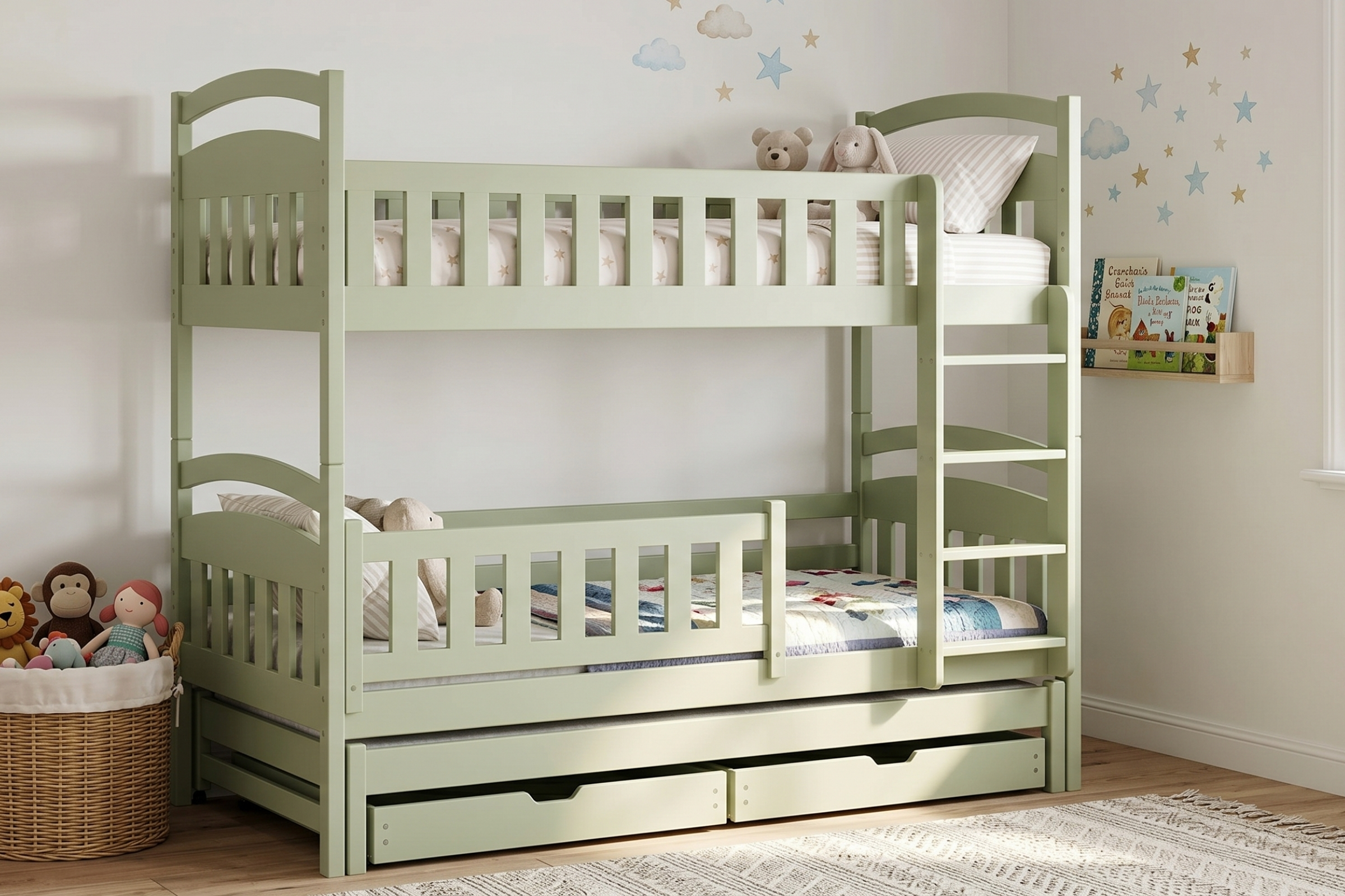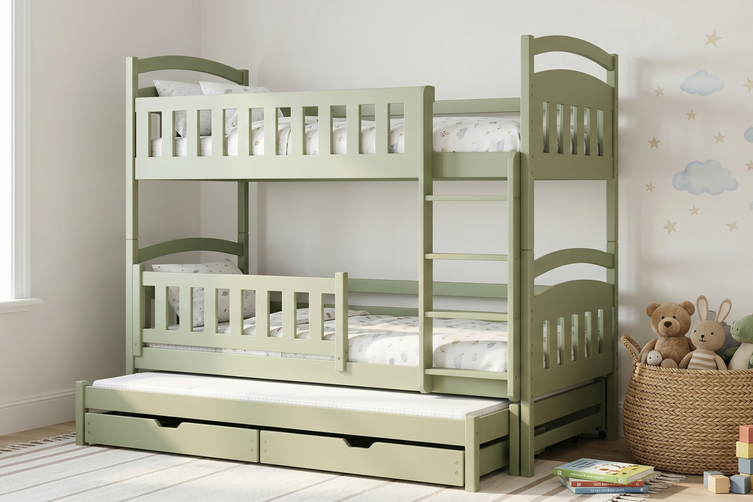 Das Etagenbett MIA 90x200 in Olivgrün ist die praktische Lösung für Familien, die 3 Schlafplätze auf wenig Raum brauchen. Es kombiniert Massivholz, 2 Bettkästen, 3 Lattenroste und eine universell montierbare Leiter. Ideal für Kinderzimmer, Geschwisterzimmer und Übernachtungsgäste.