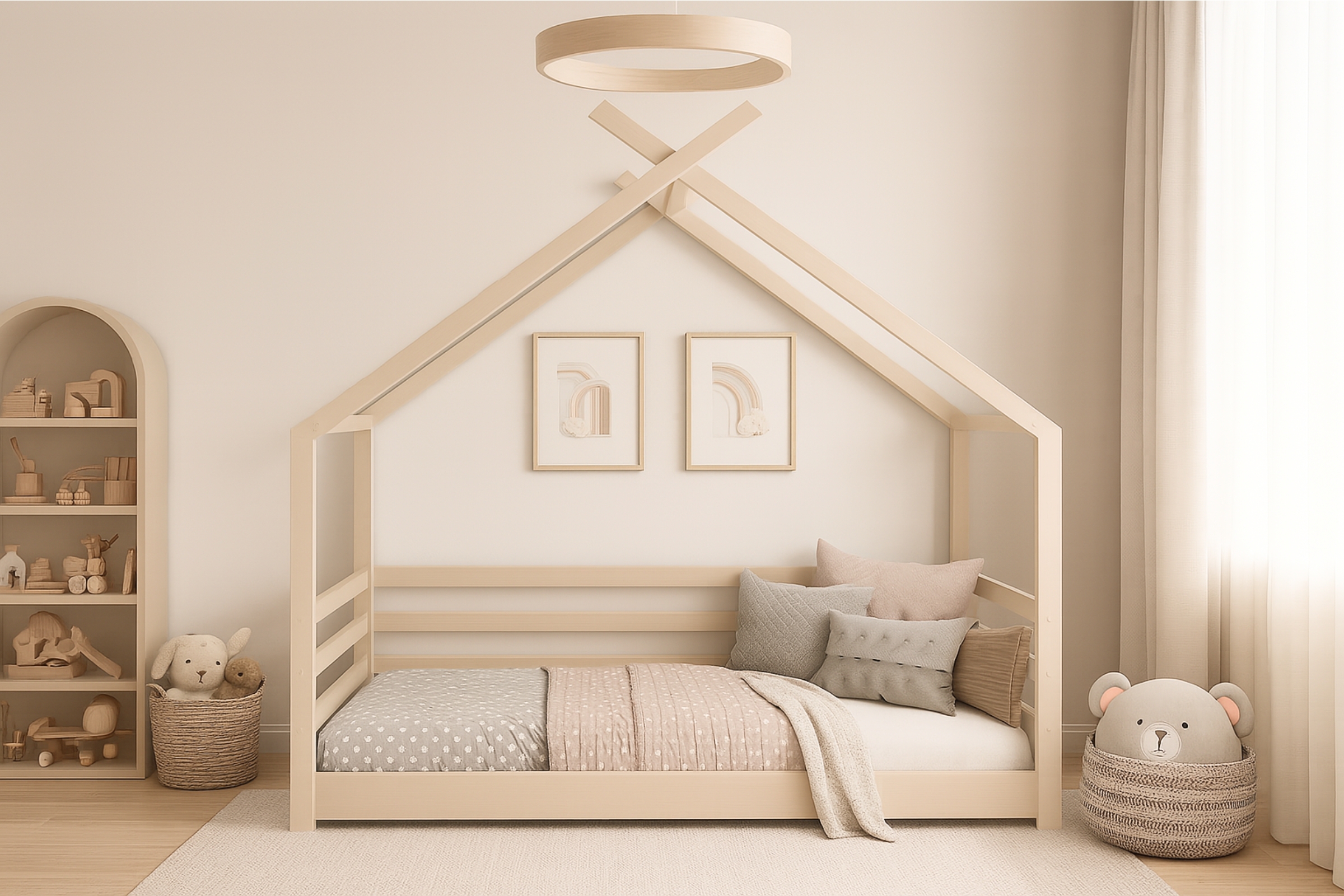 Unser Hausbett MOON wird nach unseren Prinzipien angefertigt – die Matratze befindet sich niedrig über dem Boden. Ihr Kind kann selbständig hinein- und heraussteigen, ohne das Risiko, sich zu verletzen oder herunterzufallen. Die ungewöhnliche Form sorgt dafür, dass Kinder das Hausbett nicht nur nachts, sondern auch tagsüber sehr gerne nutzen, weil es ein hervorragender Ort für kreatives Spielen ist.