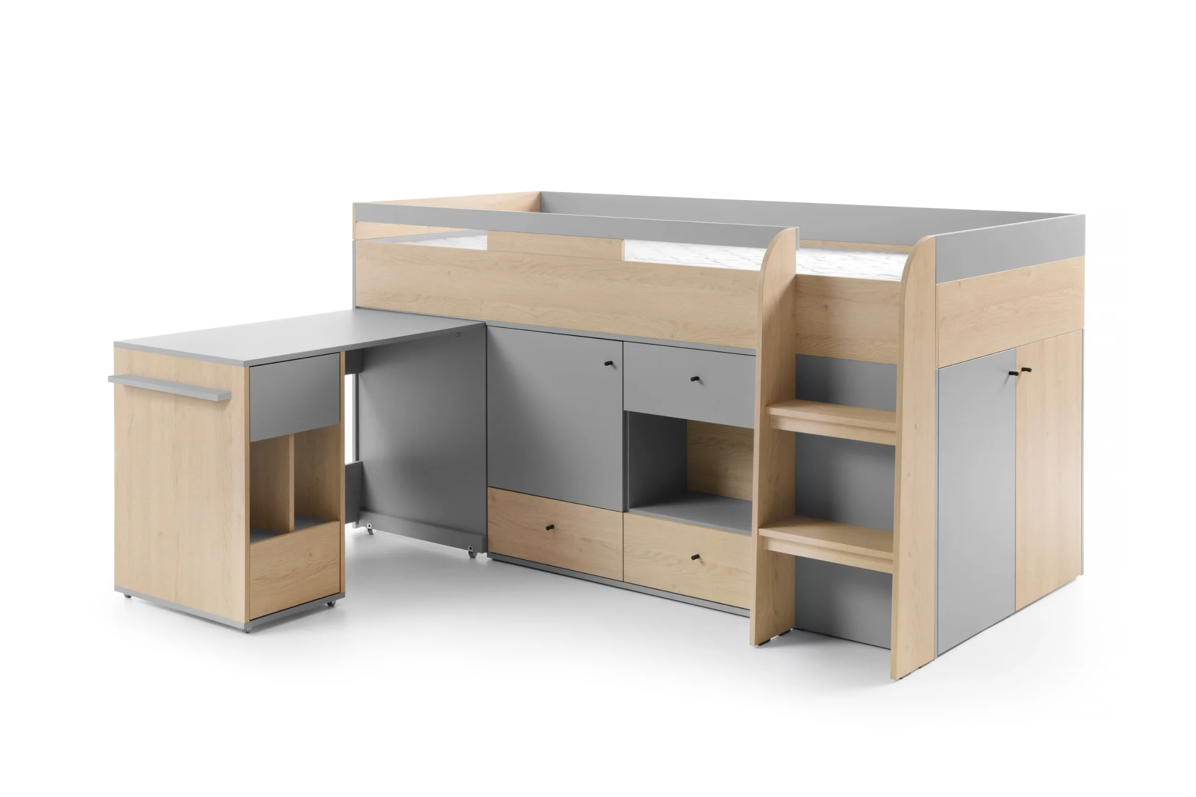 Das OLAF 08 Funktionsbett ist die perfekte Lösung für kleine Zimmer. Mit einem integrierten Schreibtisch, Regalen, Schränken und Schubladen bietet es viel Stauraum und spart Platz. Wenn mehr Platz für Spiele benötigt wird, kann das Schreibtisch einfach hinein geschoben werden. Hinter den geschlossenen Fronten lassen sich Spielzeuge, Puppen und Lernmaterialien sicher verstauen. Dank der niedrigen Leiter kommt Ihr Kind sicher ins Bett, und die eingebaute Struktur schützt vor einem nächtlichen Sturz.