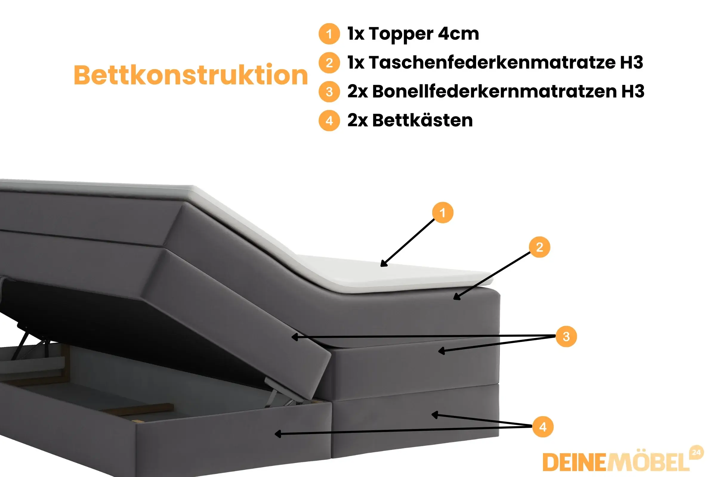 - Zwei Bonellfederkernmatratzen H3 (18 cm) und eine Taschenfederkernmatratze H3 (20 cm) für optimale Unterstützung