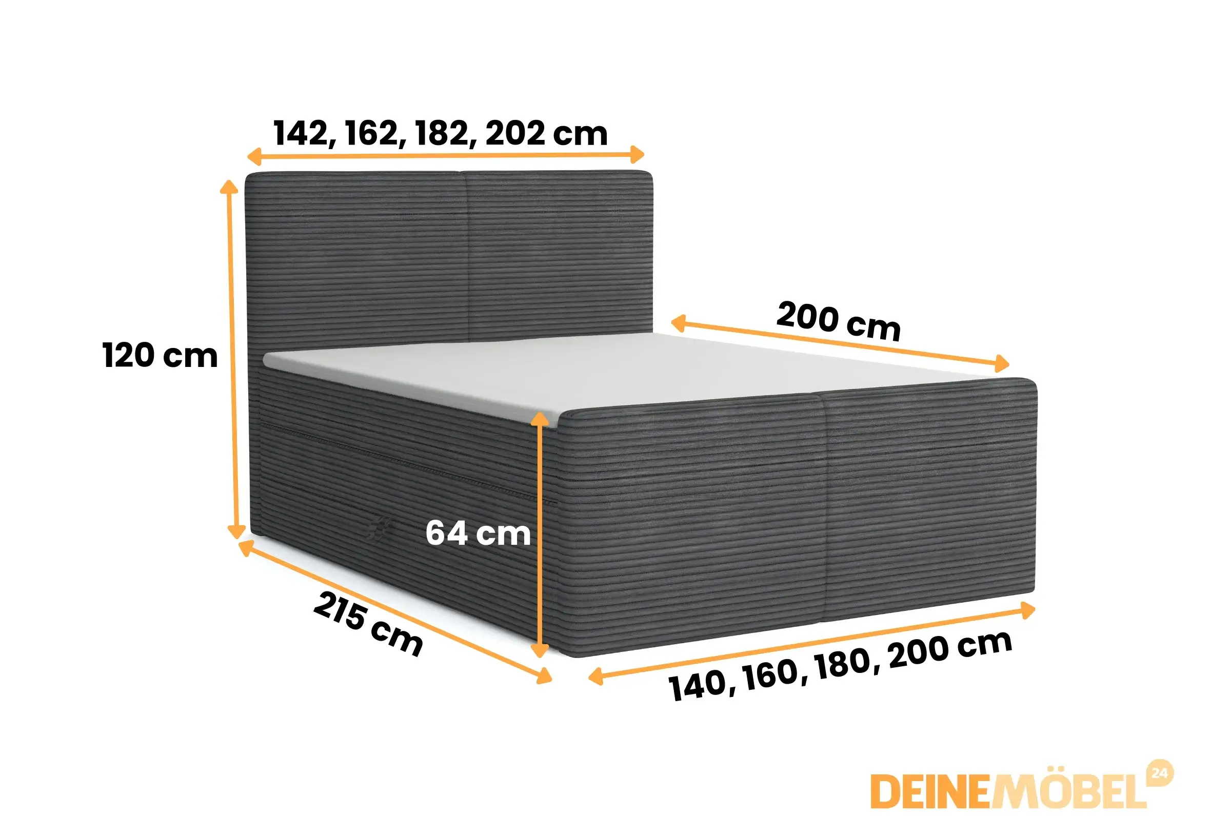 - 160 x 200 cm: Außenmaße 162x215x120 cm (B/T/H)