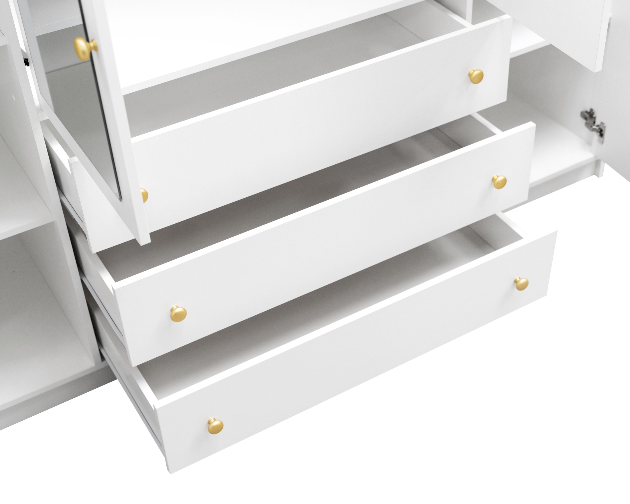 Die Kommode SEATTLE ergänzt das Set ideal: Mit 3 Schubladen und 2 Türen mit 1 Einlegeboden entsteht zusätzlicher Stauraum für Dokumente, Textilien und Alltagsgegenstände. Die klare Form und die eleganten goldfarbenen Details unterstreichen den modernen Charakter.