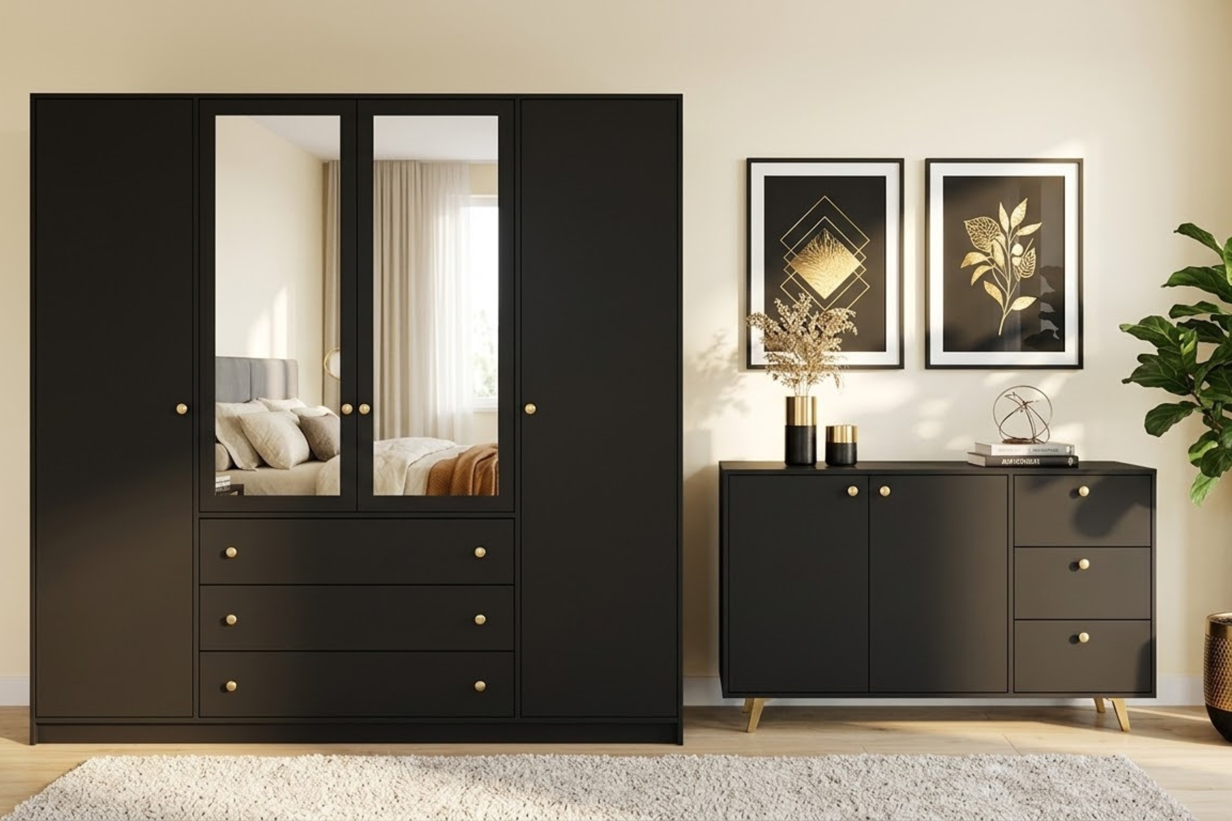 Modern, elegant und besonders großzügig: Das Schlafzimmer-Set SEATTLE C verbindet stilvolles Design mit viel Stauraum und einer edlen Ausstrahlung. Die Kombination aus 4-türigem Kleiderschrank mit Spiegeln und Kommode mit Schubladen und Türen schafft Ordnung und verleiht Schlafzimmer, Ankleidezimmer oder Flur einen hochwertigen Look. Die matten Fronten mit goldfarbenen Griffen und Füßen setzen stilvolle Akzente.
