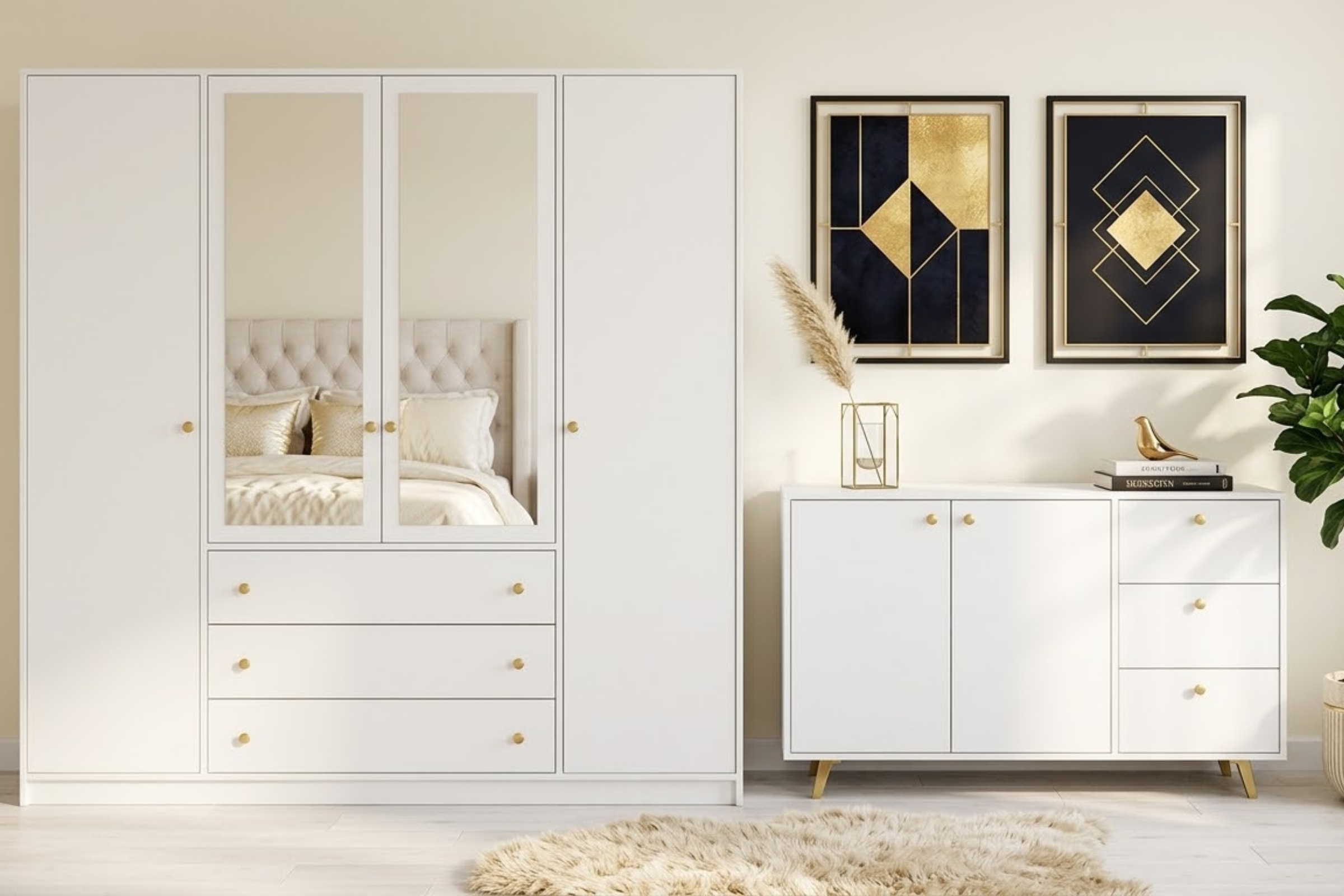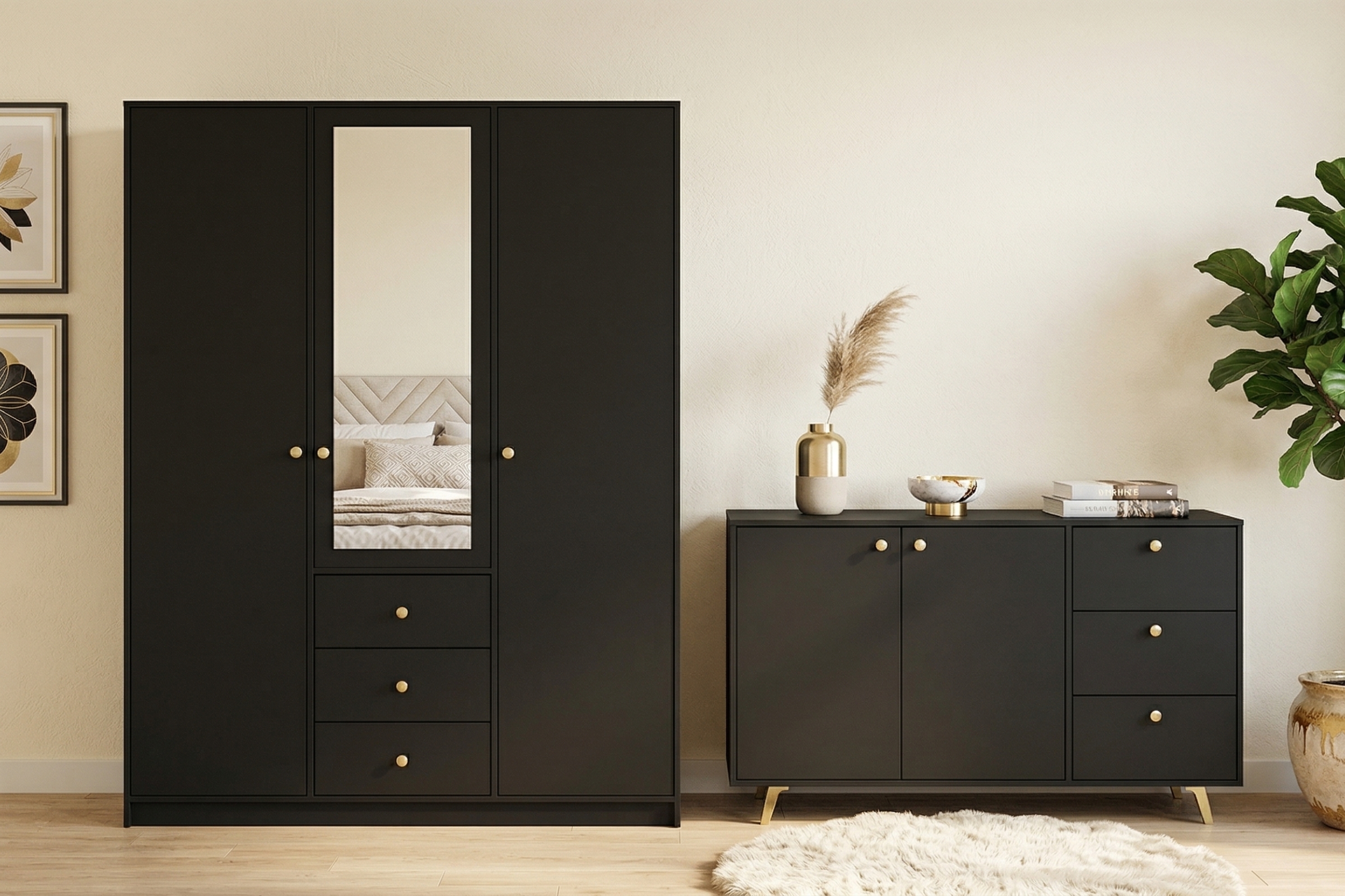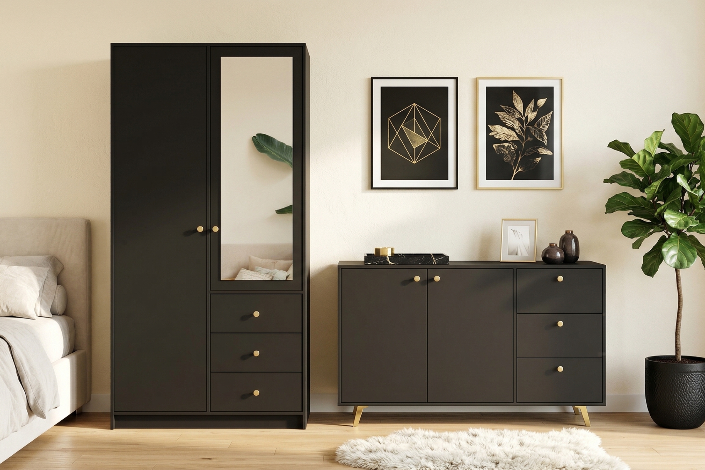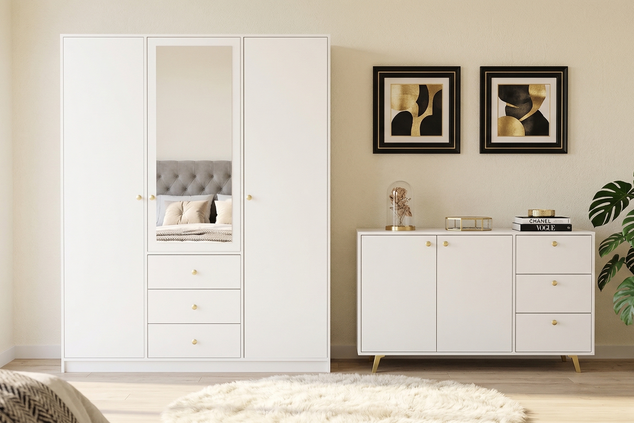 Die Kommode SEATTLE verbindet elegantes Design, praktischen Stauraum und eine moderne Ausstrahlung. Mit 3 Schubladen, 2 Türen und stilvollen goldfarbenen Griffen und Füßen ist sie die ideale Wahl für alle, die ihr Zuhause geschmackvoll und ordentlich einrichten möchten. Besonders praktisch: Mit den Möbeln der SEATTLE Kollektion können Sie eine komplette, harmonische Schlafzimmereinrichtung gestalten.