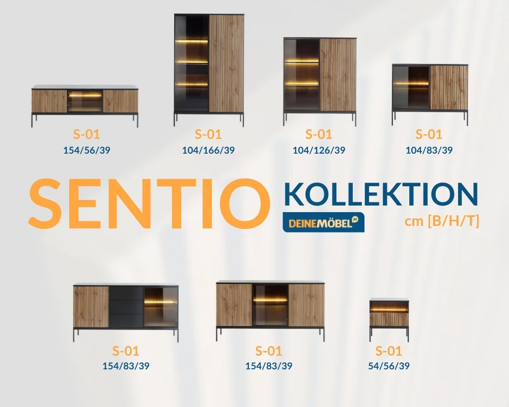 SENTIO umfasst sieben stilvolle Möbeleinheiten: zwei niedrige und hohe Vitrinen, einen modernen TV-Schrank, einen edlen Nachttisch sowie drei vielseitige Kommoden in verschiedenen Konfigurationen. Die Möbelstücke ruhen auf robusten Stahlfüßen, die trotz ihrer schwarzen Farbe eine luftige Leichtigkeit verleihen.