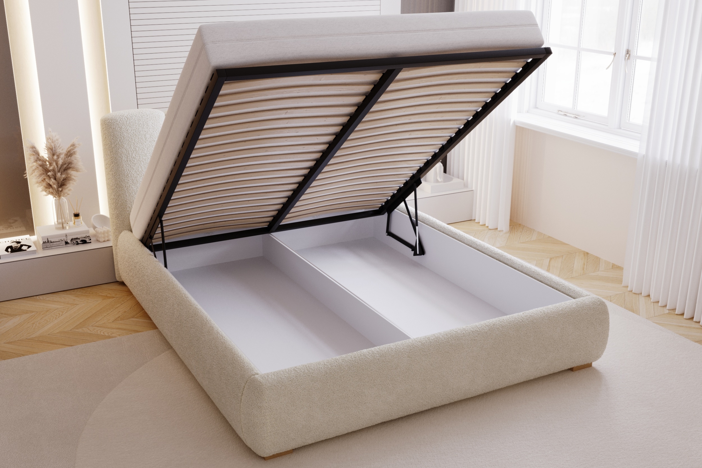 - Polsterbett mit Bettkasten für Bettwäsche, Decken, Kissen oder saisonale Kleidung