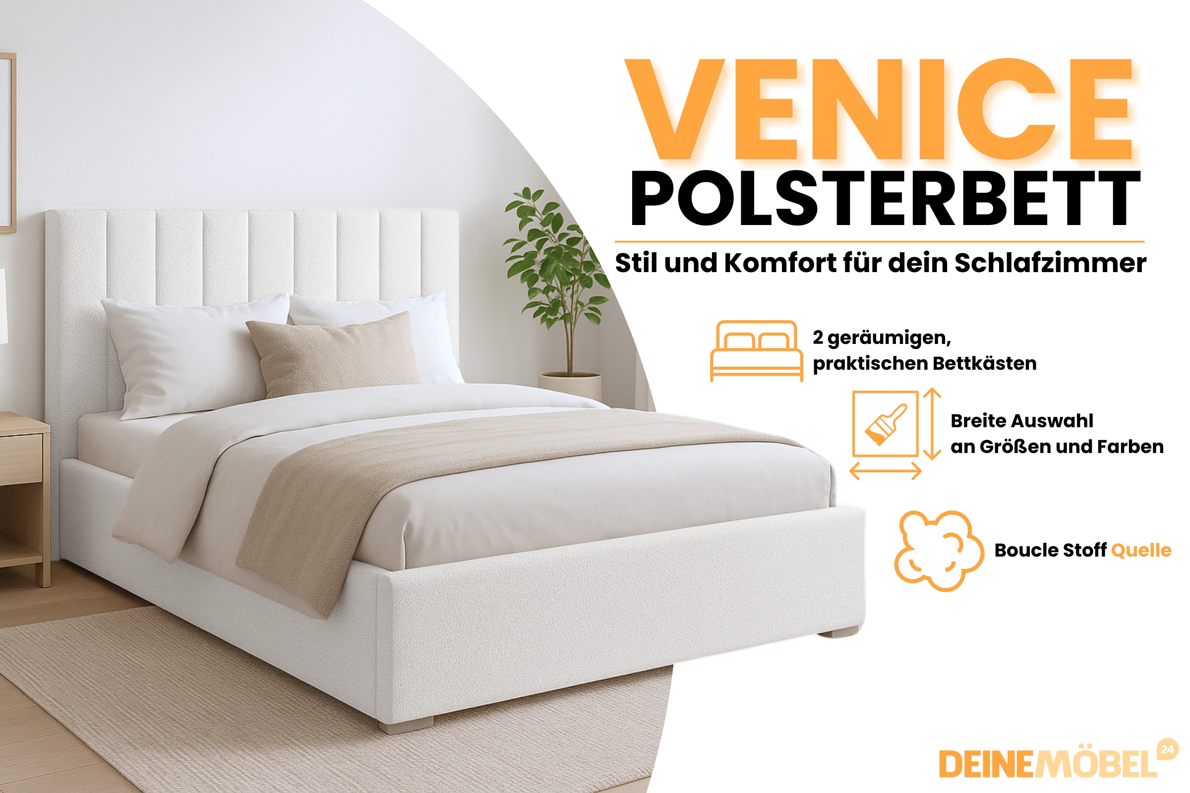 Verleihen Sie Ihrem Schlafzimmer mit dem VENICE Polsterbett einen modernen und eleganten Look – jetzt entdecken und entspannt schlafen!